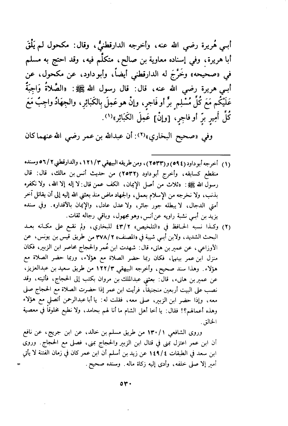 أَبِي هُرَيْرَةَ رَضِيَ اللَّهُ عَنْهُ، وَأَخْرَجَهُ الدَّارَقُطْنِيُّ، قَالَ: مَكْحُولٌ لَمْ يَلْقَ أَبَا هُرَيْرَةَ. وَفِي إِسْنَادِهِ مُعَاوِيَةُ بْنُ صَالِحٍ، مُتَكَلَّمٌ فِيهِ، وَقَدِ احْتَجَّ بِهِ مُسْلِمٌ فِي صَحِيحِهِ. وَخَرَّجَ لَهُ الدَّارَقُطْنِيُّ أَيْضًا وَأَبُو دَاوُدَ، عَنْ مَكْحُولٍ، عَنْ أَبِي هُرَيْرَةَ رَضِيَ اللَّهُ عَنْهُ، قَالَ: قَالَ رَسُولُ اللَّهِ صَلَّى اللَّهُ عَلَيْهِ وَسَلَّمَ: «الصَّلَاةُ وَاجِبَةٌ عَلَيْكُمْ مَعَ كُلِّ مُسْلِمٍ، بَرٍّ أَوْ فَاجِرٍ، وَإِنْ هُوَ عَمِلَ بِالْكَبَائِرِ، وَالْجِهَادُ وَاجِبٌ عَلَيْكُمْ مَعَ كُلِّ أَمِيرٍ، بَرٍّ أَوْ فَاجِرٍ، [وَإِنْ] عَمِلَ الْكَبَائِرَ» . وَفِي صَحِيحِ الْبُخَارِيِّ: أَنَّ عَبْدَ اللَّهِ بْنَ عُمَرَ رَضِيَ اللَّهُ عَنْهُمَا كَانَ