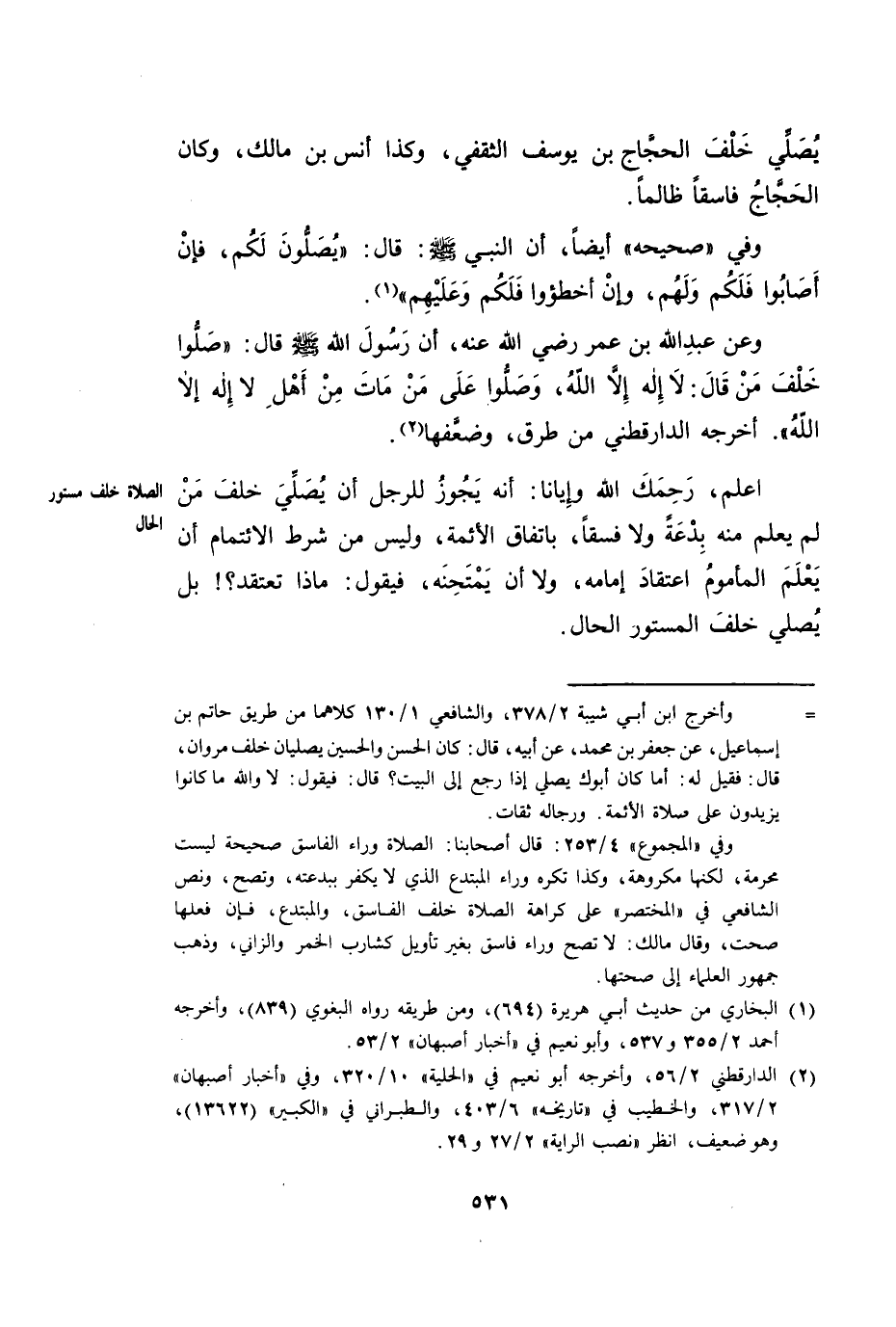 اعْلَمْ، رَحِمَكَ اللَّهُ وَإِيَّانَا: أَنَّهُ يَجُوزُ لِلرَّجُلِ أَنْ يُصَلِّيَ خَلْفَ مَنْ لَمْ يَعْلَمْ مِنْهُ بِدْعَةً وَلَا فِسْقًا، بِاتِّفَاقِ الْأَئِمَّةِ، وَلَيْسَ مِنْ شَرْطِ الِائْتِمَامِ أَنْ يَعْلَمَ الْمَأْمُومُ اعْتِقَادَ إِمَامِهِ، وَلَا أَنْ يَمْتَحِنَهُ، فَيَقُولُ: مَاذَا تَعْتَقِدُ؟ ! بَلْ يُصَلِّي خَلْفَ الْمَسْتُورِ الْحَالِ الصَّلَاةُ خَلْفَ مَسْتُورِ الْحَالِ.