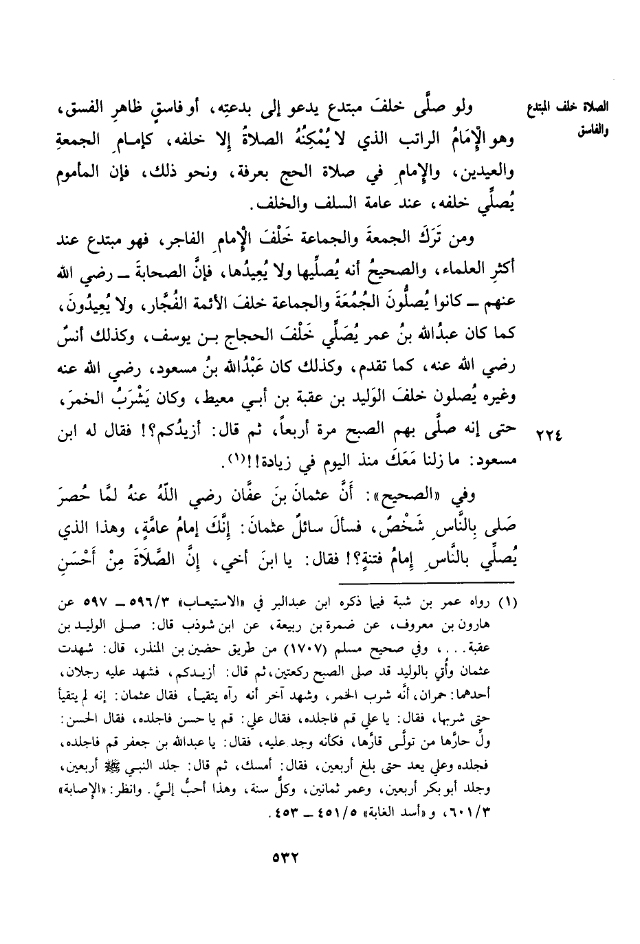 وَمَنْ تَرَكَ الْجُمْعَةَ وَالْجَمَاعَةَ خَلْفَ الْإِمَامِ الْفَاجِرِ، فَهُوَ مُبْتَدِعٌ عِنْدَ أَكْثَرِ الْعُلَمَاءِ. وَالصَّحِيحُ أَنَّهُ يُصَلِّيهَا وَلَا يُعِيدُهَا، فَإِنَّ الصَّحَابَةَ رَضِيَ اللَّهُ عَنْهُمْ كَانُوا يُصَلُّونَ الْجُمْعَةَ وَالْجَمَاعَةَ خَلْفَ الْأَئِمَّةِ الْفُجَّارِ وَلَا يُعِيدُونَ، كَمَا كَانَ عَبْدُ اللَّهِ بْنُ عُمَرَ يُصَلِّي خَلْفَ الْحَجَّاجِ بْنِ يُوسُفَ، وَكَذَلِكَ أَنَسٌ رَضِيَ اللَّهُ عَنْهُ، كَمَا تَقَدَّمَ، وَكَذَلِكَ عَبْدُ اللَّهِ بْنُ مَسْعُودٍ رَضِيَ اللَّهُ عَنْهُ وَغَيْرُهُ يُصَلُّونَ خَلْفَ الْوَلِيدِ بْنِ عُقْبَةَ بْنِ أَبِي مُعَيْطٍ، وَكَانَ يَشْرَبُ الْخَمْرَ، حَتَّى إِنَّهُ صَلَّى بِهِمُ الصُّبْحَ مَرَّةً أَرْبَعًا، ثُمَّ قَالَ: أَزِيدُكُمْ؟ ! فَقَالَ لَهُ ابْنُ مَسْعُودٍ: مَا زِلْنَا مَعَكَ مُنْذُ الْيَوْمِ فِي زِيَادَةٍ! !