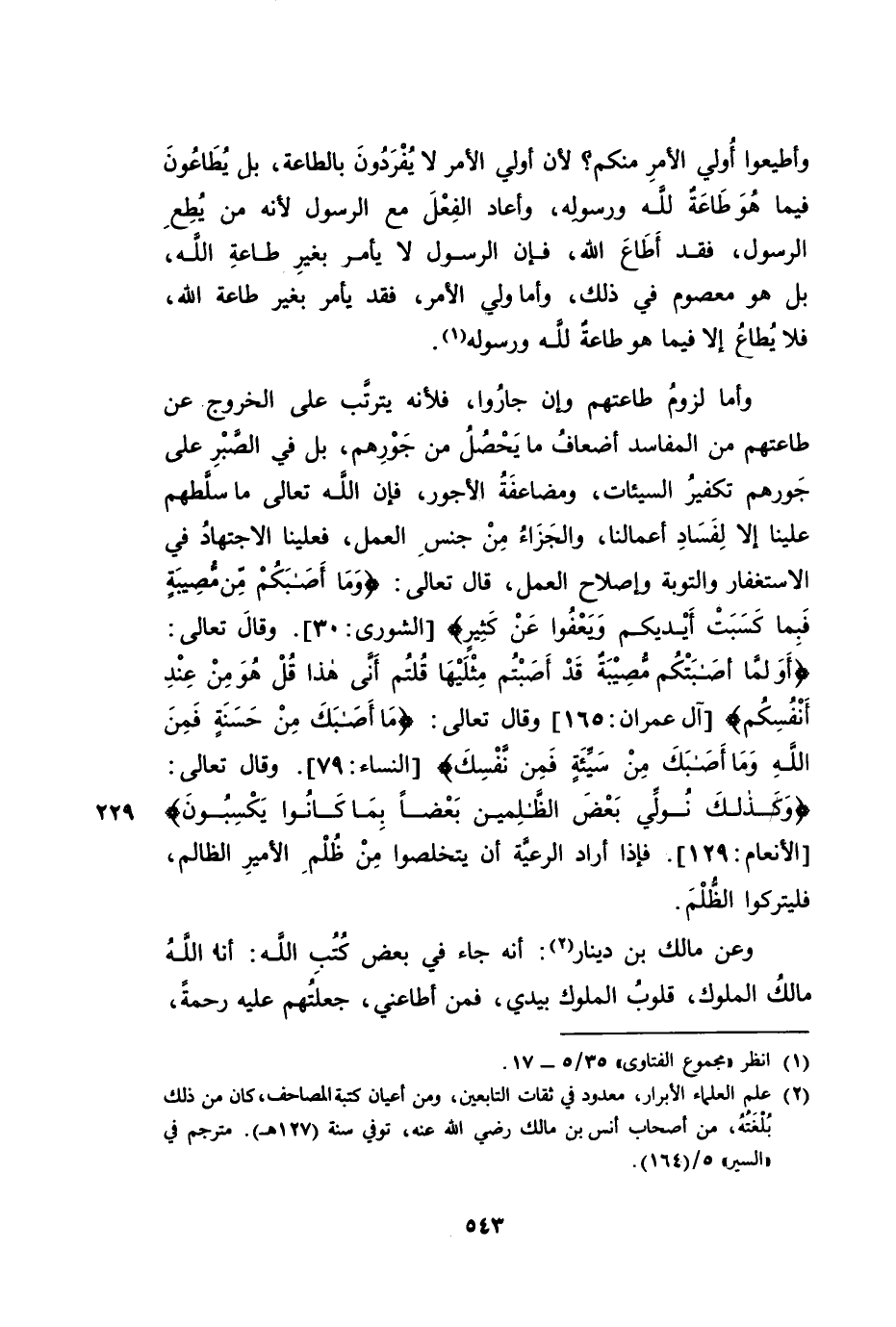 وَعَنْ مَالِكِ بْنِ دِينَارٍ: أَنَّهُ جَاءَ فِي بَعْضِ كُتُبِ اللَّهِ: أَنَا اللَّهُ مَالِكُ الْمُلْكِ، قُلُوبُ الْمُلُوكِ بِيَدِي، فَمَنْ أَطَاعَنِي جَعَلْتُهُمْ عَلَيْهِ رَحْمَةً،