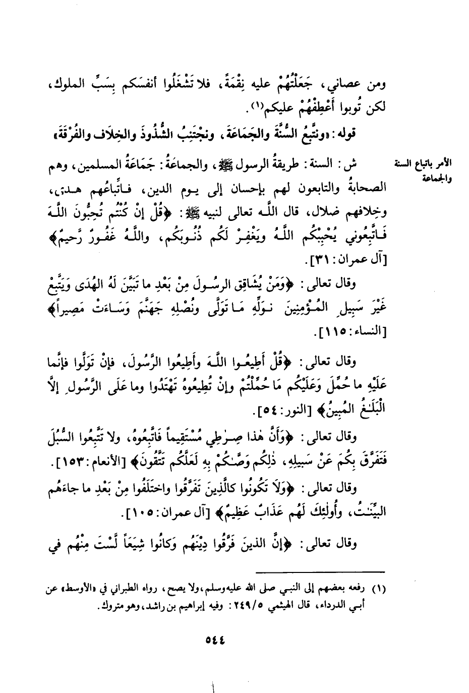 قَوْلُهُ: (وَنَتَّبِعُ السُّنَّةَ وَالْجَمَاعَةَ، الِالْتِزَامُ بِالسُّنَّةِ وَالْجَمَاعَةِ وَنَجْتَنِبُ الشُّذُوذَ وَالْخِلَافَ وَالْفُرْقَةَ) .