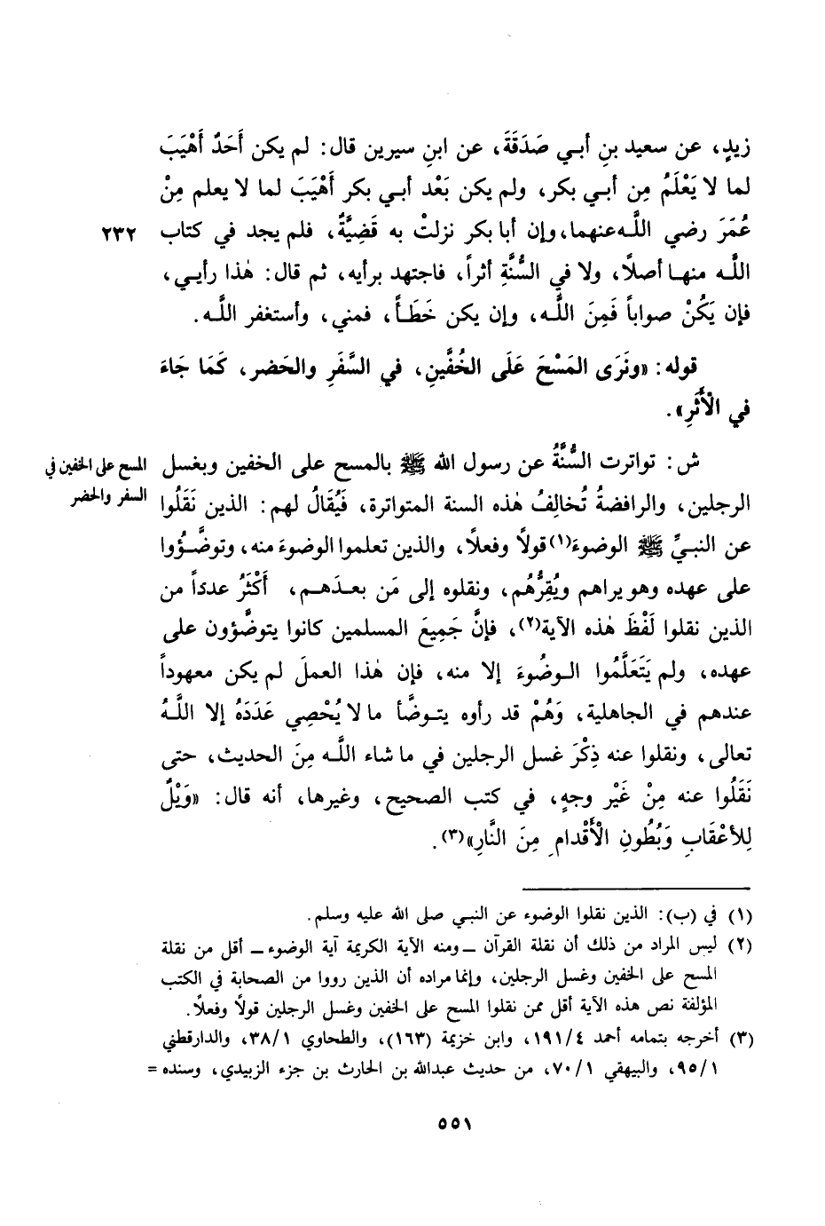 قَوْلُهُ: (وَنَرَى الْمَسْحَ عَلَى الْخُفَّيْنِ، فِي السَّفَرِ وَالْحَضَرِ، كَمَا جَاءَ فِي الْأَثَرِ) . ش: تَوَاتَرَتِ السُّنَّةُ عَنْ رَسُولِ اللَّهِ صَلَّى اللَّهُ عَلَيْهِ وَسَلَّمَ بِالْمَسْحِ عَلَى الْخُفَّيْنِ وَبِغَسْلِ الرِّجْلَيْنِ، وَالرَّافِضَةُ تُخَالِفُ هَذِهِ السُّنَّةَ الْمُتَوَاتِرَةَ، فَيُقَالُ لَهُمُ: الَّذِينَ نَقَلُوا عَنِ النَّبِيِّ صَلَّى اللَّهُ عَلَيْهِ وَسَلَّمَ الْوُضُوءَ قَوْلًا وَفِعْلًا، وَالَّذِينَ تَعَلَّمُوا الْوُضُوءَ مِنْهُ وَتَوَضَّئُوا عَلَى عَهْدِهِ وَهُوَ يَرَاهُمْ وَيُقِرُّهُمْ، وَنَقَلُوهُ إِلَى مَنْ بَعْدَهُمْ، أَكْثَرُ عَدَدًا مِنَ الَّذِينَ نَقَلُوا لَفْظَ هَذِهِ الْآيَةِ. فَإِنَّ جَمِيعَ الْمُسْلِمِينَ كَانُوا يَتَوَضَّئُونَ عَلَى عَهْدِهِ، وَلَمْ يَتَعَلَّمُوا الْوُضُوءَ إِلَّا مِنْهُ، فَإِنَّ هَذَا الْعَمَلَ لَمْ يَكُنْ مَعْهُودًا عِنْدَهُمْ فِي الْجَاهِلِيَّةِ، وَهُمْ قَدْ رَأَوْهُ يَتَوَضَّأُ مَا لَا يُحْصِي عَدَدَهُ إِلَّا اللَّهُ تَعَالَى، وَنَقَلُوا عَنْهُ ذِكْرَ غَسْلِ الرِّجْلَيْنِ فِي مَا شَاءَ اللَّهُ مِنَ الْحَدِيثِ، حَتَّى نَقَلُوا عَنْهُ مِنْ غَيْرِ وَجْهٍ، فِي كُتُبِ الصَّحِيحِ وَغَيْرِهَا، أَنَّهُ قَالَ: «وَيْلٌ لِلْأَعْقَابِ وَبُطُونِ الْأَقْدَامِ مِنَ النَّارِ»