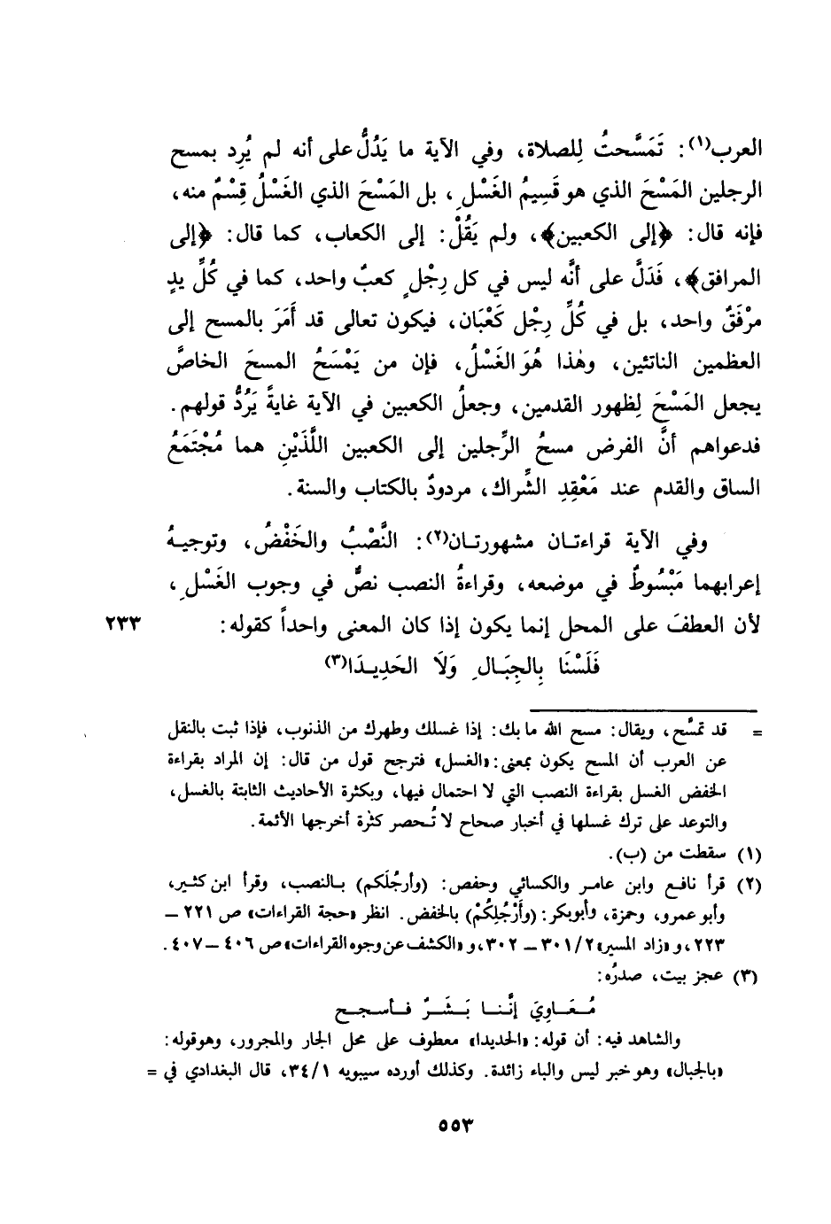 وَفِي الْآيَةِ قِرَاءَتَانِ مَشْهُورَتَانِ: النَّصْبُ وَالْخَفْضُ، وَتَوْجِيهُ إِعْرَابِهِمَا مَبْسُوطٌ فِي مَوْضِعِهِ. وَقِرَاءَةُ النَّصْبِ نَصٌّ فِي وُجُوبِ الْغَسْلِ، لِأَنَّ الْعَطْفَ عَلَى الْمَحَلِّ إِنَّمَا يَكُونُ إِذَا كَانَ الْمَعْنَى وَاحِدًا، كَقَوْلِهِ: