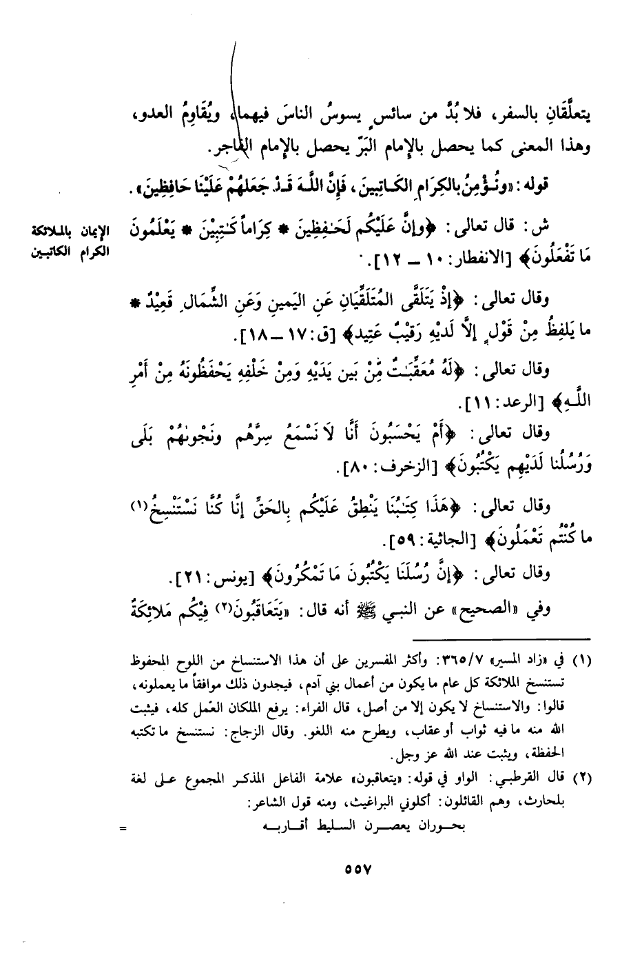 ش: قَالَ تَعَالَى: {وَإِنَّ عَلَيْكُمْ لَحَافِظِينَ كِرَامًا كَاتِبِينَ يَعْلَمُونَ مَا تَفْعَلُونَ} [الانفطار: 10]