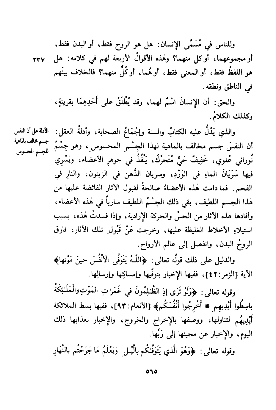 وَالَّذِي يَدُلُّ عَلَيْهِ الْكِتَابُ وَالسُّنَّةُ وَإِجْمَاعُ الصَّحَابَةِ وَأَدِلَّةُ الْعَقْلِ: أَنَّ النَّفْسَ جِسْمٌ مُخَالِفٌ بِالْمَاهِيَّةِ لِهَذَا الْجِسْمِ الْمَحْسُوسِ، وَهُوَ جِسْمٌ نُورَانِيٌّ عُلْوِيٌّ، خَفِيفٌ حَيٌّ مُتَحَرِّكٌ، يَنْفُذُ فِي جَوْهَرِ الْأَعْضَاءِ، وَيَسْرِي فِيهَا سَرَيَانَ الْمَاءِ فِي الْوَرْدِ، وَسَرَيَانَ الدُّهْنِ فِي الزَّيْتُونِ، وَالنَّارِ فِي الْفَحْمِ. فَمَا دَامَتْ هَذِهِ الْأَعْضَاءُ صَالِحَةً لِقَبُولِ الْآثَارِ الْفَائِضَةِ عَلَيْهَا مِنْ هَذَا الْجِسْمِ اللَّطِيفِ، بَقِيَ ذَلِكَ الْجِسْمُ اللَّطِيفُ سَارِيًا فِي هَذِهِ الْأَعْضَاءِ، وَأَفَادَهَا هَذِهِ الْآثَارُ، مِنَ الْحِسِّ وَالْحَرَكَةِ الْإِرَادِيَّةِ، وَإِذَا فَسَدَتْ هَذِهِ، بِسَبَبِ اسْتِيلَاءِ الْأَخْلَاطِ الْغَلِيظَةِ عَلَيْهَا، وَخَرَجَتْ عَنْ قَبُولِ تِلْكَ الْآثَارِ، فَارَقَ الرُّوحُ الْبَدَنَ، وَانْفَصَلَ إِلَى عَالَمِ الْأَرْوَاحِ.