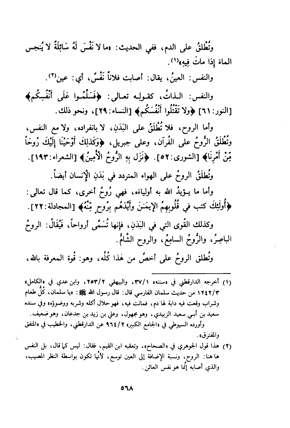 وَأَمَّا الرُّوحُ فَلَا يُطْلَقُ عَلَى الْبَدَنِ، لَا بِانْفِرَادِهِ، وَلَا مَعَ النَّفْسِ. وَتُطْلَقُ الرُّوحُ عَلَى الْقُرْآنِ، وَعَلَى جِبْرِيلَ، {وَكَذَلِكَ أَوْحَيْنَا إِلَيْكَ رُوحًا مِنْ أَمْرِنَا} [الشُّورَى: 52] . {نَزَلَ بِهِ الرُّوحُ الْأَمِينُ} [الشُّعَرَاءِ: 193] .