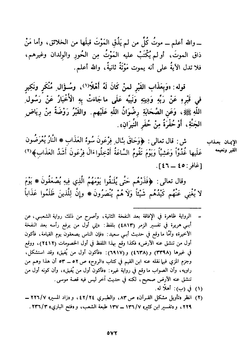 قَوْلُهُ: (وَبِعَذَابِ الْقَبْرِ لِمَنْ كَانَ لَهُ أَهْلًا، وَسُؤَالِ مُنْكَرٍ وَنَكِيرٍ فِي قَبْرِهِ عَنْ رَبِّهِ وَدِينِهِ وَنَبِيِّهِ، عَلَى مَا جَاءَتْ بِهِ الْأَخْبَارُ عَنْ رَسُولِ اللَّهِ صَلَّى اللَّهُ عَلَيْهِ وَسَلَّمَ، وَعَنِ الصَّحَابَةِ رِضْوَانُ اللَّهِ عَلَيْهِمْ. وَالْقَبْرُ رَوْضَةٌ مِنْ رِيَاضِ الْجَنَّةِ، أَوْ حُفْرَةٌ مِنْ حُفَرِ النِّيرَانِ) . ش: قَالَ تَعَالَى: {وَحَاقَ بِآلِ فِرْعَوْنَ سُوءُ الْعَذَابِ - النَّارُ يُعْرَضُونَ عَلَيْهَا غُدُوًّا وَعَشِيًّا وَيَوْمَ تَقُومُ السَّاعَةُ أَدْخِلُوا آلَ فِرْعَوْنَ أَشَدَّ الْعَذَابِ} [غافر: 45 - 46]