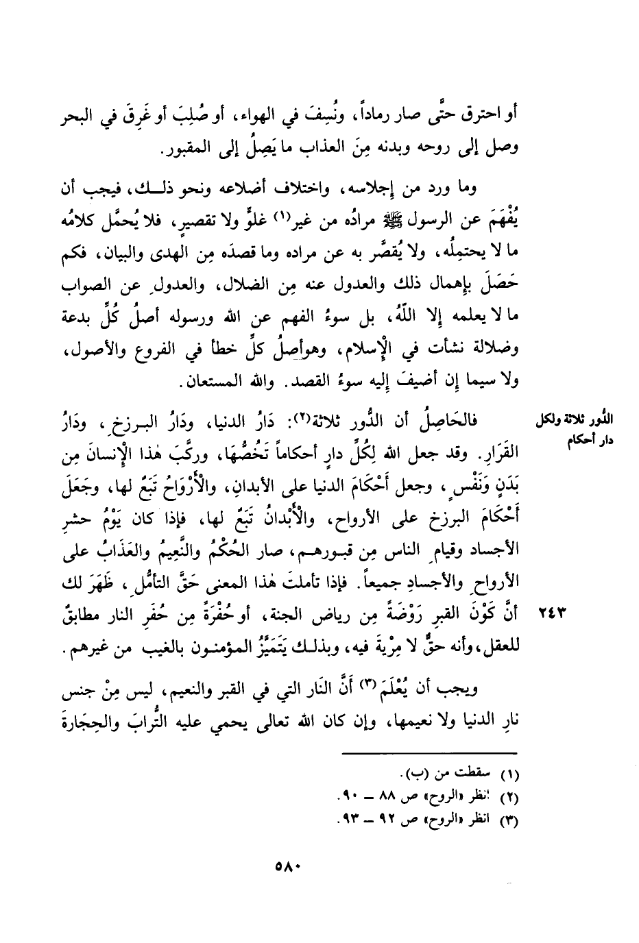 فَالْحَاصِلُ أَنَّ الدُّورَ ثَلَاثَةٌ: دَارُ الدُّنْيَا، وَدَارُ الْبَرْزَخِ، وَدَارُ الْقَرَارِ. وَقَدْ جَعَلَ اللَّهُ لِكُلِّ دَارٍ أَحْكَامًا تَخُصُّهَا، وَرَكَّبَ هَذَا الْإِنْسَانَ مِنْ بَدَنٍ وَنَفْسٍ، وَجَعَلَ أَحْكَامَ الدُّنْيَا عَلَى الْأَبْدَانِ، وَالْأَرْوَاحُ تَبَعٌ لَهَا، وَجَعَلَ أَحْكَامَ الْبَرْزَخِ عَلَى الْأَرْوَاحِ، وَالْأَبْدَانُ تَبَعٌ لَهَا، فَإِذَا جَاءَ يَوْمُ حَشْرِ الْأَجْسَادِ وَقِيَامِ النَّاسِ مِنْ قُبُورِهِمْ - صَارَ الْحُكْمُ وَالنَّعِيمُ وَالْعَذَابُ عَلَى الْأَرْوَاحِ وَالْأَجْسَادِ جَمِيعًا. فَإِذَا تَأَمَّلْتَ هَذَا الْمَعْنَى حَقَّ التَّأَمُّلِ، ظَهَرَ لَكَ أَنَّ كَوْنَ الْقَبْرِ رَوْضَةً مِنْ رِيَاضِ الْجَنَّةِ أَوْ حُفْرَةً مِنْ حُفَرِ النَّارِ مُطَابِقٌ لِلْعَقْلِ، وَأَنَّهُ حَقٌّ لَا مِرْيَةَ فِيهِ، وَبِذَلِكَ يَتَمَيَّزُ الْمُؤْمِنُونَ بِالْغَيْبِ مِنْ غَيْرِهِمْ.