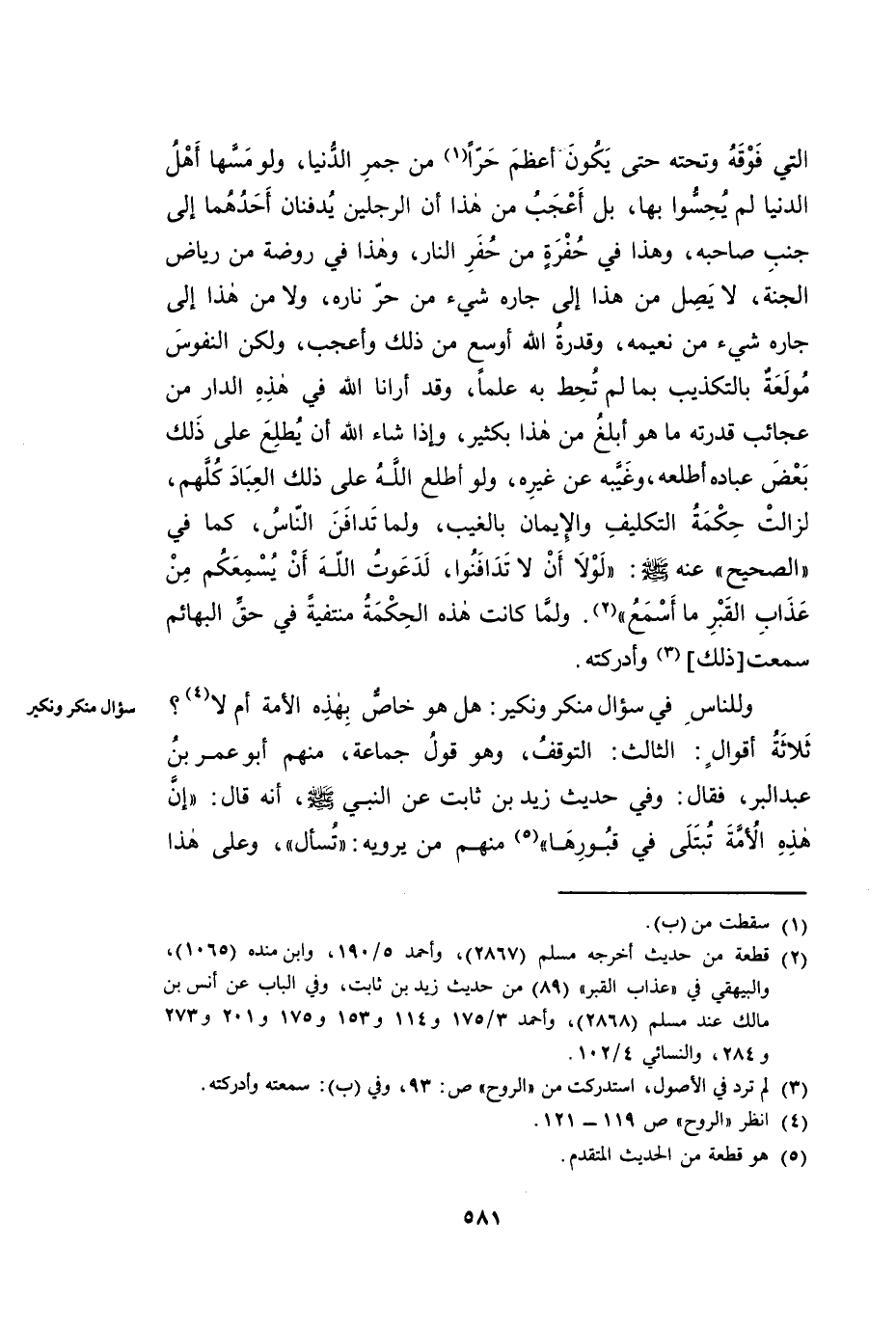 وَلِلنَّاسِ فِي سُؤَالِ مُنْكَرٍ وَنَكِيرٍ: هَلْ هُوَ خَاصٌّ بِهَذِهِ الْأُمَّةِ أَمْ لَا ثَلَاثَةُ أَقْوَالٍ: الثَّالِثُ التَّوَقُّفُ، وَهُوَ قَوْلُ جَمَاعَةٍ، مِنْهُمْ أَبُو عُمَرَ بْنُ عَبْدِ الْبَرِّ، فَقَالَ: وَفِي حَدِيثِ زَيْدِ بْنِ ثَابِتٍ عَنِ النَّبِيِّ صَلَّى اللَّهُ عَلَيْهِ وَسَلَّمَ، قَالَ: «إِنَّ هَذِهِ الْأُمَّةَ تُبْتَلَى فِي قُبُورِهَا» - مِنْهُمْ مَنْ يَرْوِيهِ تُسْأَلُ، وَعَلَى هَذَا