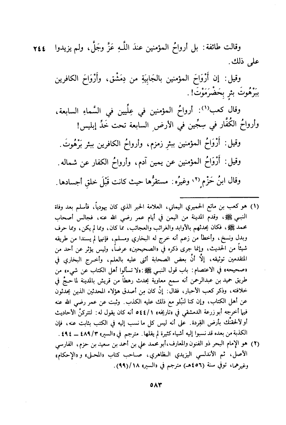 وَقَالَ كَعْبٌ: أَرْوَاحُ الْمُؤْمِنِينَ فِي عِلِّيِّينَ فِي السَّمَاءِ السَّابِعَةِ، وَأَرْوَاحُ الْكَافِرِينَ فِي سِجِّينَ فِي الْأَرْضِ السَّابِعَةِ تَحْتَ خَدِّ إِبْلِيسَ!