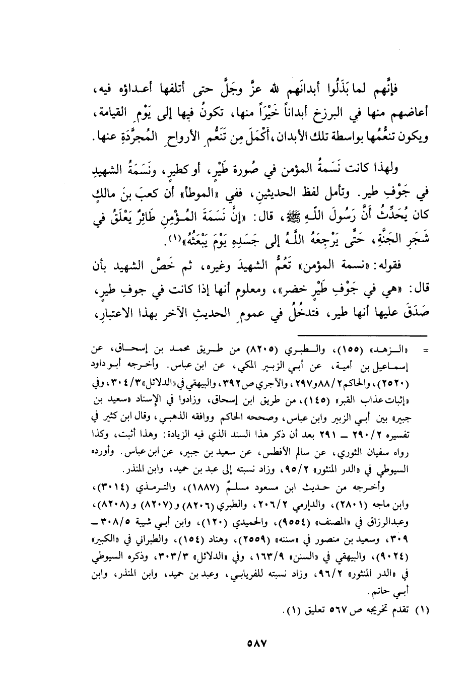 وَلِهَذَا كَانَتْ نَسَمَةُ الْمُؤْمِنِ فِي صُورَةِ طَيْرٍ، أَوْ كَطَيْرٍ، وَنَسَمَةُ الشَّهِيدِ فِي جَوْفِ طَيْرٍ. وَتَأَمَّلْ لَفْظَ الْحَدِيثَيْنِ، فَفِي الْمُوَطَّأِ أَنَّ كَعْبَ بْنَ مَالِكٍ كَانَ يُحَدِّثُ أَنَّ رَسُولَ اللَّهِ صَلَّى اللَّهُ عَلَيْهِ وَسَلَّمَ، قَالَ: «إِنَّ نَسَمَةَ الْمُؤْمِنِ طَائِرٍ يَعْلَقُ فِي شَجَرِ الْجَنَّةِ، حَتَّى يُرْجِعَهُ اللَّهُ إِلَى جَسَدِهِ يَوْمَ يَبْعَثُهُ» .