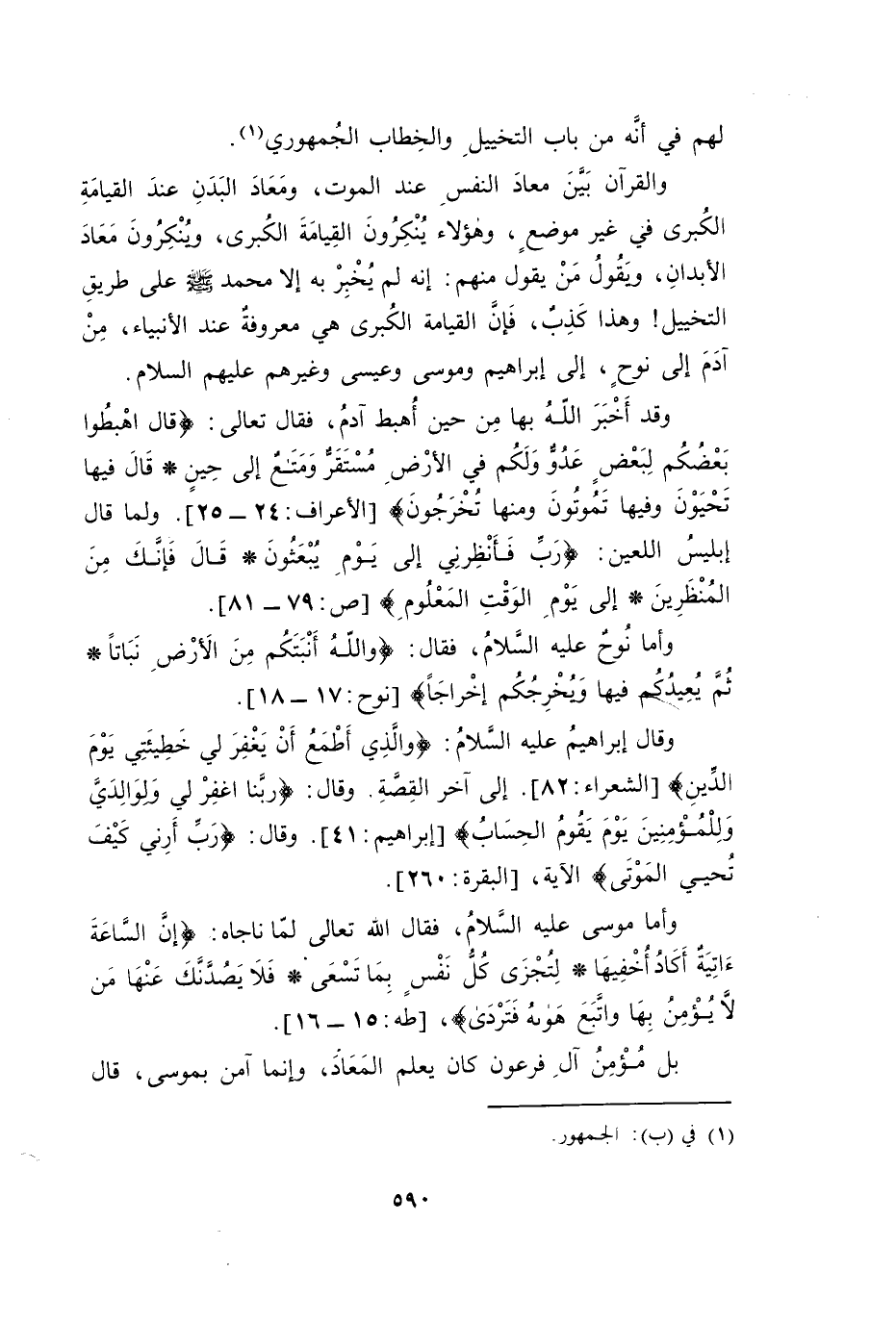 وَالْقُرْآنُ بَيَّنَ مَعَادَ النَّفْسِ عِنْدَ الْمَوْتِ، وَمَعَادَ الْبَدَنِ عِنْدَ الْقِيَامَةِ الْكُبْرَى فِي غَيْرِ مَوْضِعٍ. وَهَؤُلَاءِ يُنْكِرُونَ الْقِيَامَةَ الْكُبْرَى، وَيُنْكِرُونَ مَعَادَ الْأَبْدَانِ، وَيَقُولُ مَنْ يَقُولُ مِنْهُمْ: إِنَّهُ لَمْ يُخْبِرْ بِهِ إِلَّا مُحَمَّدٌ صَلَّى اللَّهُ عَلَيْهِ وَسَلَّمَ عَلَى طَرِيقِ التَّخْيِيلِ! وَهَذَا كَذِبٌ، فَإِنَّ الْقِيَامَةَ الْكُبْرَى هِيَ مَعْرُوفَةٌ عِنْدَ الْأَنْبِيَاءِ، مِنْ آدَمَ إِلَى نُوحٍ، إِلَى إِبْرَاهِيمَ وَمُوسَى وَعِيسَى وَغَيْرِهِمْ عَلَيْهِمُ السَّلَامُ.