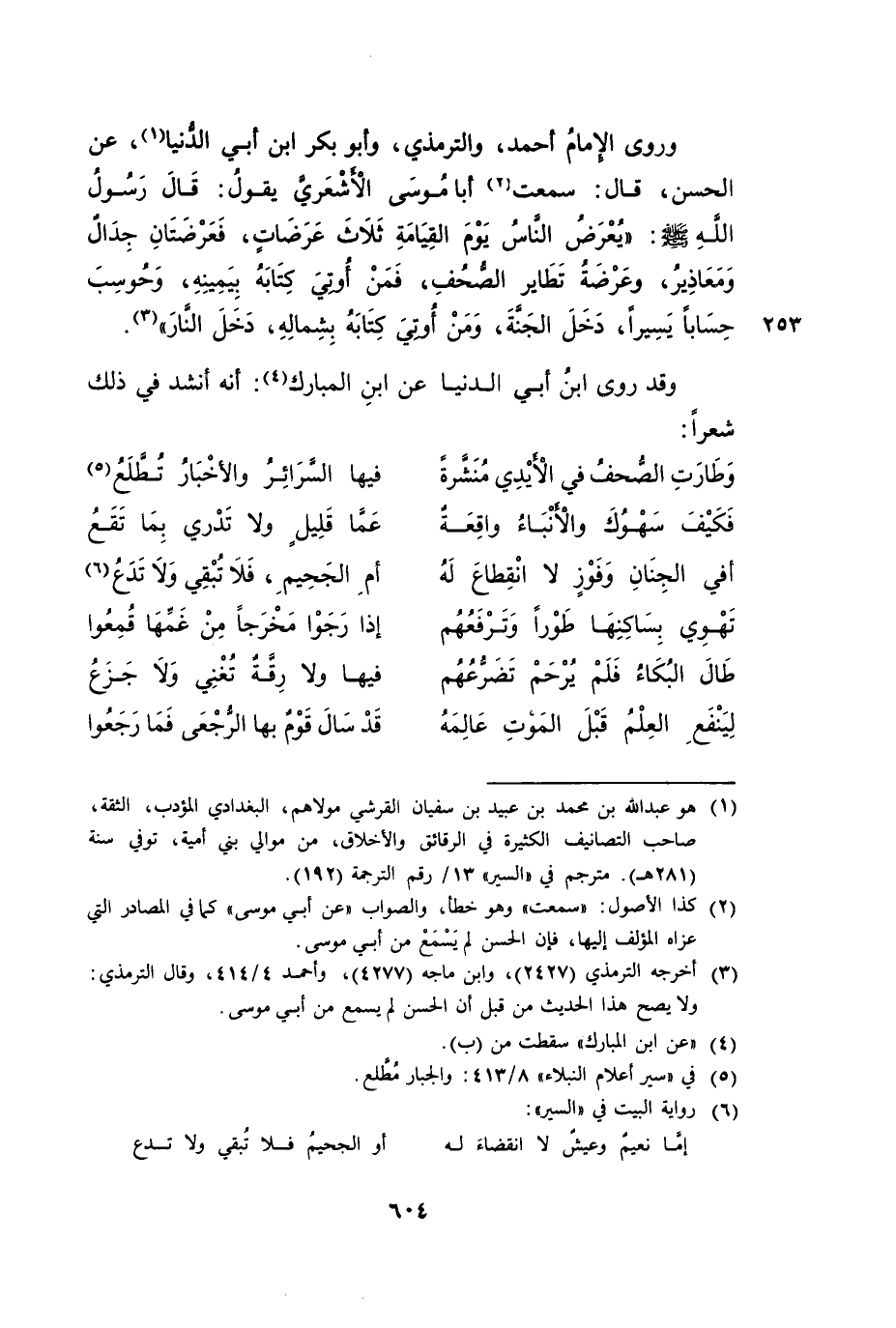 وَرَوَى الْإِمَامُ أَحْمَدُ، وَالتِّرْمِذِيُّ، وَأَبُو بَكْرِ ابْنُ أَبِي الدُّنْيَا، عَنِ الْحَسَنِ، قَالَ: سَمِعْتُ أَبَا مُوسَى الْأَشْعَرِيَّ يَقُولُ: «قَالَ رَسُولُ اللَّهِ صَلَّى اللَّهُ عَلَيْهِ وَسَلَّمَ: يُعْرَضُ النَّاسُ يَوْمَ الْقِيَامَةِ ثَلَاثَ عَرَضَاتٍ، فَعَرْضَتَانِ جِدَالٌ وَمَعَاذِيرُ، وَعَرْضَةُ تَطَايُرِ الصُّحُفِ، فَمَنْ أُوتِيَ كِتَابَهُ بِيَمِينِهِ، وَحُوسِبَ حَسِابًا يَسِيرًا، دَخَلَ الْجَنَّةَ، وَمَنْ أُوتِيَ كِتَابَهُ بِشِمَالِهِ، دَخَلَ النَّارَ» . وَقَدْ رَوَى ابْنُ أَبِي الدُّنْيَا عَنِ ابْنِ الْمُبَارَكِ: أَنَّهُ أَنْشَدَ فِي ذَلِكَ شِعْرًا: