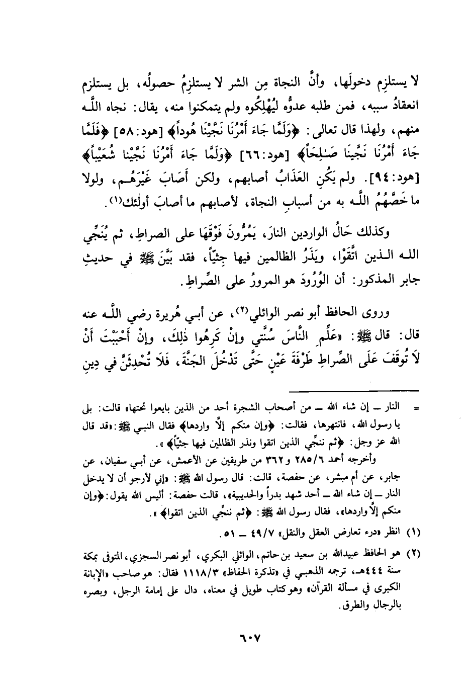 لَا يَسْتَلْزِمُ دُخُولَهَا، وَأَنَّ النَّجَاةَ مِنَ الشَّرِّ لَا تَسْتَلْزِمُ حُصُولَهُ، بَلْ يَسْتَلْزِمُ انْعِقَادَ سَبَبِهِ، فَمَنْ طَلَبَهُ عَدُوُّهُ لِيُهْلِكُوهُ وَلَمْ يَتَمَكَّنُوا مِنْهُ، يُقَالُ: نَجَّاهُ اللَّهُ مِنْهُمْ. وَلِهَذَا قَالَ تَعَالَى: {وَلَمَّا جَاءَ أَمْرُنَا نَجَّيْنَا هُودًا} [هُودٍ: 58] {فَلَمَّا جَاءَ أَمْرُنَا نَجَّيْنَا صَالِحًا} [هُودٍ: 66] . {وَلَمَّا جَاءَ أَمْرُنَا نَجَّيْنَا شُعَيْبًا} [هُودٍ: 94] . وَلَمْ يَكُنِ الْعَذَابُ أَصَابَهُمْ، وَلَكِنْ أَصَابَ غَيْرَهُمْ، وَلَوْلَا مَا خَصَّهُمُ اللَّهُ بِهِ مِنْ أَسْبَابِ النَّجَاةِ لَأَصَابَهُمْ مَا أَصَابَ أُولَئِكَ.