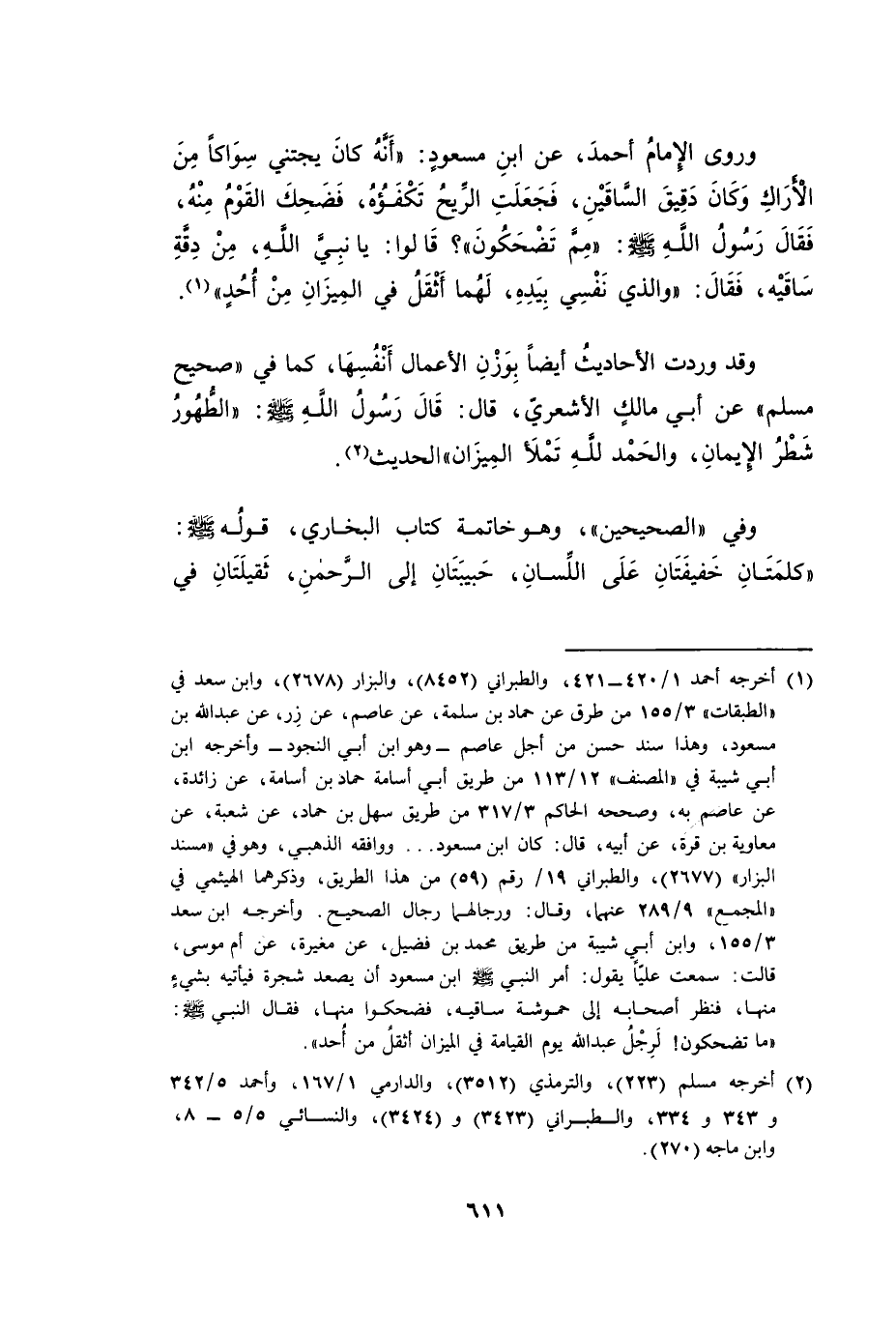 وَرَوَى الْإِمَامُ أَحْمَدُ، «عَنِ ابْنِ مَسْعُودٍ: أَنَّهُ كَانَ يَجْنِي سِوَاكًا مِنَ الْأَرَاكِ، وَكَانَ دَقِيقَ السَّاقَيْنِ، فَجَعَلَتِ الرِّيحُ تَكْفَؤُهُ، فَضَحِكَ الْقَوْمُ مِنْهُ، فَقَالَ رَسُولُ اللَّهِ صَلَّى اللَّهُ عَلَيْهِ وَسَلَّمَ: مِمَّ تَضْحَكُونَ؟ قَالُوا: يَا نَبِيَّ اللَّهِ، مِنْ دِقَّةِ سَاقَيْهِ، فَقَالَ: وَالَّذِي نَفْسِي بِيَدِهِ، لَهُمَا أَثْقَلُ فِي الْمِيزَانِ مِنْ أُحُدٍ.»