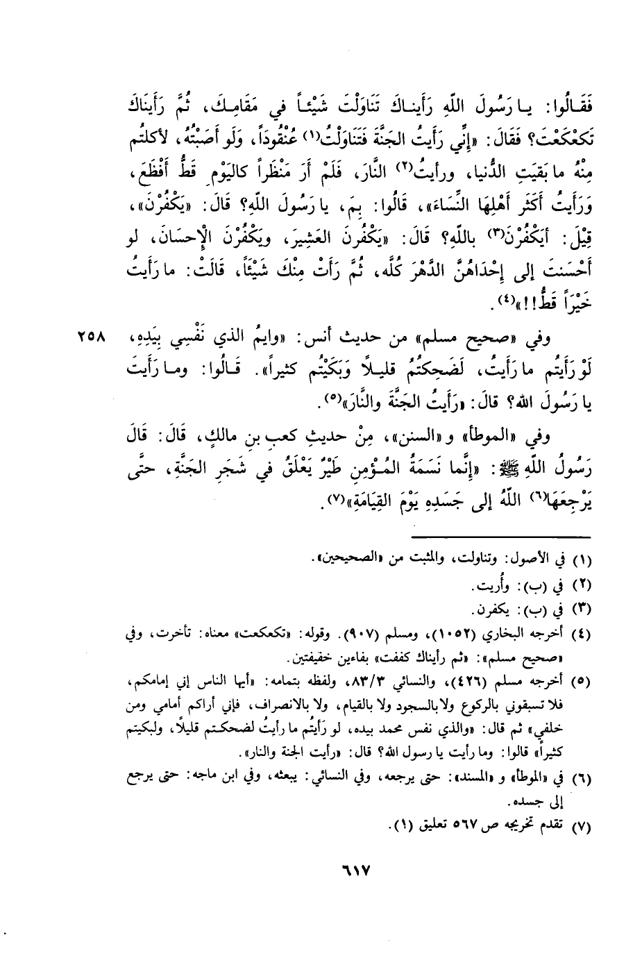فَقَالُوا: يَا رَسُولَ اللَّهِ رَأَيْنَاكَ تَنَاوَلْتَ شَيْئًا فِي مَقَامِكَ، ثُمَّ رَأَيْنَاكَ تَكَعْكَعْتَ؟ فَقَالَ: إِنِّي رَأَيْتُ الْجَنَّةَ، وَتَنَاوَلْتُ عُنْقُودًا، وَلَوْ أَصَبْتُهُ لَأَكَلْتُمْ مِنْهُ مَا بَقِيَتِ الدُّنْيَا، وَرَأَيْتُ النَّارَ، فَلَمْ أَرَ مَنْظَرًا كَالْيَوْمِ قَطُّ أَفْظَعَ، وَرَأَيْتُ أَكْثَرَ أَهْلِهَا النِّسَاءَ، قَالُوا: بِمَ يَا رَسُولَ اللَّهِ؟ قَالَ: بَكُفْرِهِنَّ، قِيلَ: أَيَكْفُرْنَ بِاللَّهِ؟ قَالَ: يَكْفُرْنَ الْعَشِيرَ، وَيَكْفُرْنَ الْإِحْسَانَ، لَوْ أَحْسَنْتَ إِلَى إِحْدَاهُنَّ الدَّهْرَ كُلَّهُ، ثُمَّ رَأَتْ مِنْكَ شَيْئًا، قَالَتْ: مَا رَأَيْتُ خَيْرًا قَطُّ! !»
