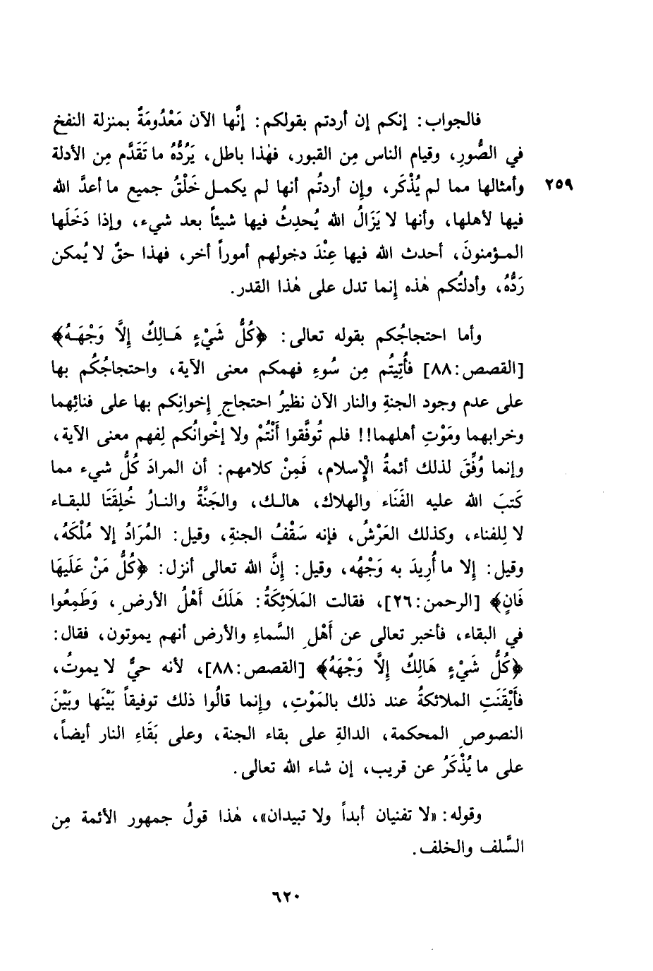 وَأَمَّا احْتِجَاجُكُمْ بِقَوْلِهِ تَعَالَى: {كُلُّ شَيْءٍ هَالِكٌ إِلَّا وَجْهَهُ} [الْقَصَصِ: 88] فَأُتِيتُمْ مِنْ سُوءِ فَهْمِكُمْ مَعْنَى الْآيَةِ، وَاحْتِجَاجُكُمْ بِهَا عَلَى عَدَمِ وُجُودِ الْجَنَّةِ وَالنَّارِ الْآنَ - نَظِيرُ احْتِجَاجِ إِخْوَانِكُمْ عَلَى فَنَائِهِمَا وَخَرَابِهِمَا وَمَوْتِ أَهْلِهِمَا! ! فَلَمْ تُوَفَّقُوا أَنْتُمْ وَلَا إِخْوَانُكُمْ لِفَهْمِ مَعْنَى الْآيَةِ، وَإِنَّمَا وُفِّقَ لِذَلِكَ أَئِمَّةُ الْإِسْلَامِ. فَمِنْ كَلَامِهِمْ: أَنَّ الْمُرَادَ كُلُّ شَيْءٍ مِمَّا كَتَبَ اللَّهُ عَلَيْهِ الْفَنَاءَ وَالْهَلَاكَ هَالِكٌ، وَالْجَنَّةُ وَالنَّارُ خُلِقَتَا لِلْبَقَاءِ لَا لِلْفَنَاءِ، وَكَذَلِكَ الْعَرْشُ، فَإِنَّهُ سَقْفُ الْجَنَّةِ. وَقِيلَ: الْمُرَادُ إِلَّا مُلْكَهُ. وَقِيلَ: إِلَّا مَا أُرِيدَ بِهِ وَجْهُهُ. وَقِيلَ: إِنَّ اللَّهَ تَعَالَى أَنْزَلَ: " {كُلُّ مَنْ عَلَيْهَا فَانٍ} [الرَّحْمَنِ: 26] ، فَقَالَتِ الْمَلَائِكَةُ: هَلَكَ أَهْلُ الْأَرْضِ، وَطَمِعُوا فِي الْبَقَاءِ، فَأَخْبَرَ تَعَالَى عَنْ أَهْلِ السَّمَاءِ وَالْأَرْضِ أَنَّهُمْ يَمُوتُونَ، فَقَالَ: {كُلُّ شَيْءٍ هَالِكٌ إِلَّا وَجْهَهُ} [الْقَصَصِ: 88] ، لِأَنَّهُ حَيٌّ لَا يَمُوتُ، فَأَيْقَنَتِ الْمَلَائِكَةُ عِنْدَ ذَلِكَ بِالْمَوْتِ. وَإِنَّمَا قَالُوا ذَلِكَ تَوْفِيقًا بَيْنَهَا وَبَيْنَ النُّصُوصِ الْمُحْكَمَةِ، الدَّالَّةِ عَلَى بَقَاءِ الْجَنَّةِ، وَعَلَى بَقَاءِ النَّارِ أَيْضًا، عَلَى مَا يُذْكَرُ عَنْ قَرِيبٍ، إِنْ شَاءَ اللَّهُ تَعَالَى.