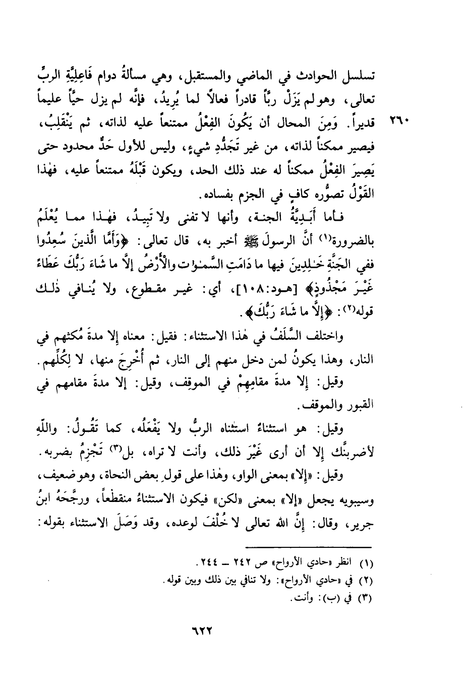 تَسَلْسُلِ الْحَوَادِثِ فِي الْمَاضِي وَالْمُسْتَقْبَلِ، وَهِيَ مَسْأَلَةُ دَوَامِ فَاعِلِيَّةِ الرَّبِّ تَعَالَى، وَهُوَ لَمْ يَزَلْ رَبًّا قَادِرًا فَعَّالًا لِمَا يُرِيدُ، فَإِنَّهُ لَمْ يَزَلْ حَيًّا عَلِيمًا قَدِيرًا. وَمِنَ الْمُحَالِ أَنْ يَكُونَ الْفِعْلُ مُمْتَنِعًا عَلَيْهِ لِذَاتِهِ، ثُمَّ يَنْقَلِبُ فَيَصِيرُ مُمْكِنًا لِذَاتِهِ، مِنْ غَيْرِ تَجَدُّدِ شَيْءٍ، وَلَيْسَ لِلْأَوَّلِ حَدٌّ مَحْدُودٌ حَتَّى يَصِيرَ الْفِعْلُ مُمْكِنًا لَهُ عِنْدَ ذَلِكَ الْحَدِّ، وَيَكُونُ قَبْلَهُ مُمْتَنِعًا عَلَيْهِ. فَهَذَا الْقَوْلُ تَصَوُّرُهُ كَافٍ فِي الْجَزْمِ بِفَسَادِهِ. فَأَمَّا أَبَدِيَّةُ الْجَنَّةِ، وَأَنَّهَا لَا تَفْنَى وَلَا تَبِيدُ، فَهَذَا مِمَّا يُعْلَمُ بِالضَّرُورَةِ أَنَّ الرَّسُولَ صَلَّى اللَّهُ عَلَيْهِ وَسَلَّمَ أَخْبَرَ بِهِ، قَالَ تَعَالَى: {وَأَمَّا الَّذِينَ سُعِدُوا فَفِي الْجَنَّةِ خَالِدِينَ فِيهَا مَا دَامَتِ السَّمَاوَاتُ وَالْأَرْضُ إِلَّا مَا شَاءَ رَبُّكَ عَطَاءً غَيْرَ مَجْذُوذٍ} [هُودٍ: 108] أَيْ غَيْرَ مَقْطُوعٍ، وَلَا يُنَافِي ذَلِكَ قَوْلَهُ: {إِلَّا مَا شَاءَ رَبُّكَ} [هود: 108] .