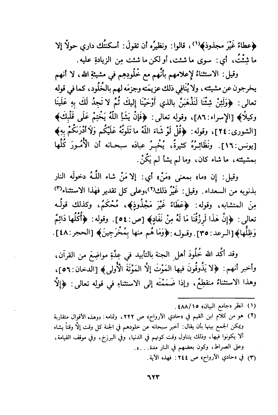 وَقِيلَ: إِنَّ (مَا) بِمَعْنَى (مَنْ) أَيْ: إِلَّا مَنْ شَاءَ اللَّهُ دُخُولَهُ النَّارَ بِذُنُوبِهِ مِنَ السُّعَدَاءِ. وَقِيلَ: غَيْرُ ذَلِكَ. وَعَلَى كُلِّ تَقْدِيرٍ، فَهَذَا الِاسْتِثْنَاءُ مِنَ الْمُتَشَابِهِ، وَقَوْلُهُ: " {عَطَاءً غَيْرَ مَجْذُوذٍ} [الْحِجْرِ: 48] .