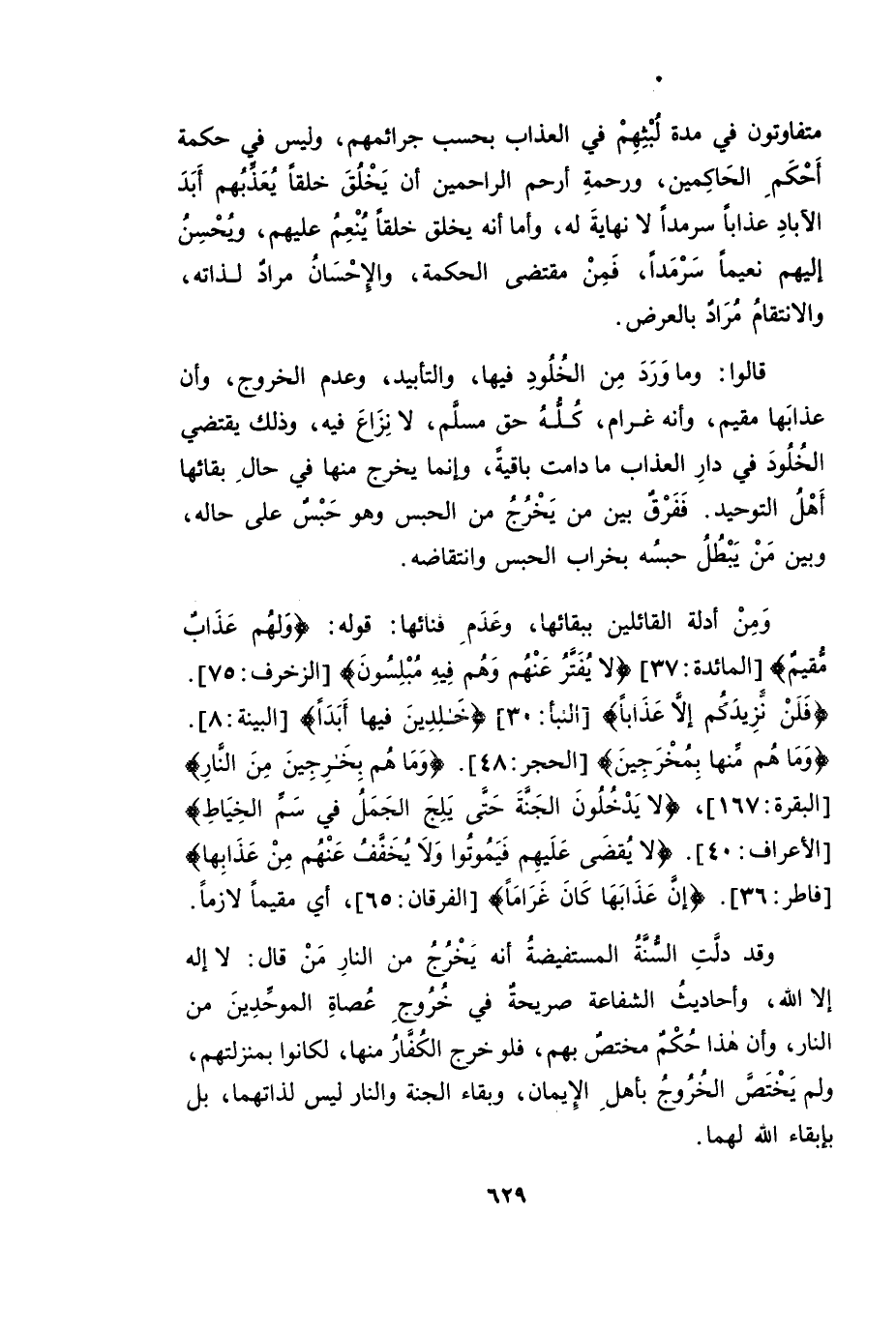 مُتَفَاوِتُونَ فِي مُدَّةِ لُبْثِهِمْ فِي الْعَذَابِ بِحَسَبِ جَرَائِمِهِمْ، وَلَيْسَ فِي حِكْمَةِ أَحْكَمِ الْحَاكِمِينَ وَرَحْمَةِ أَرْحَمِ الرَّاحِمِينَ أَنْ يَخْلُقَ خَلْقًا يُعَذِّبُهُمْ أَبَدَ الْآبَادِ عَذَابًا سَرْمَدًا لَا نِهَايَةَ لَهُ. وَأَمَّا أَنَّهُ يَخْلُقُ خَلْقًا يُنْعِمُ عَلَيْهِمْ وَيُحْسِنُ إِلَيْهِمْ نَعِيمًا سَرْمَدًا، فَمِنْ مُقْتَضَى الْحِكْمَةِ. وَالْإِحْسَانُ مُرَادٌ لِذَاتِهِ، وَالِانْتِقَامُ مُرَادٌ بِالْعَرَضِ.