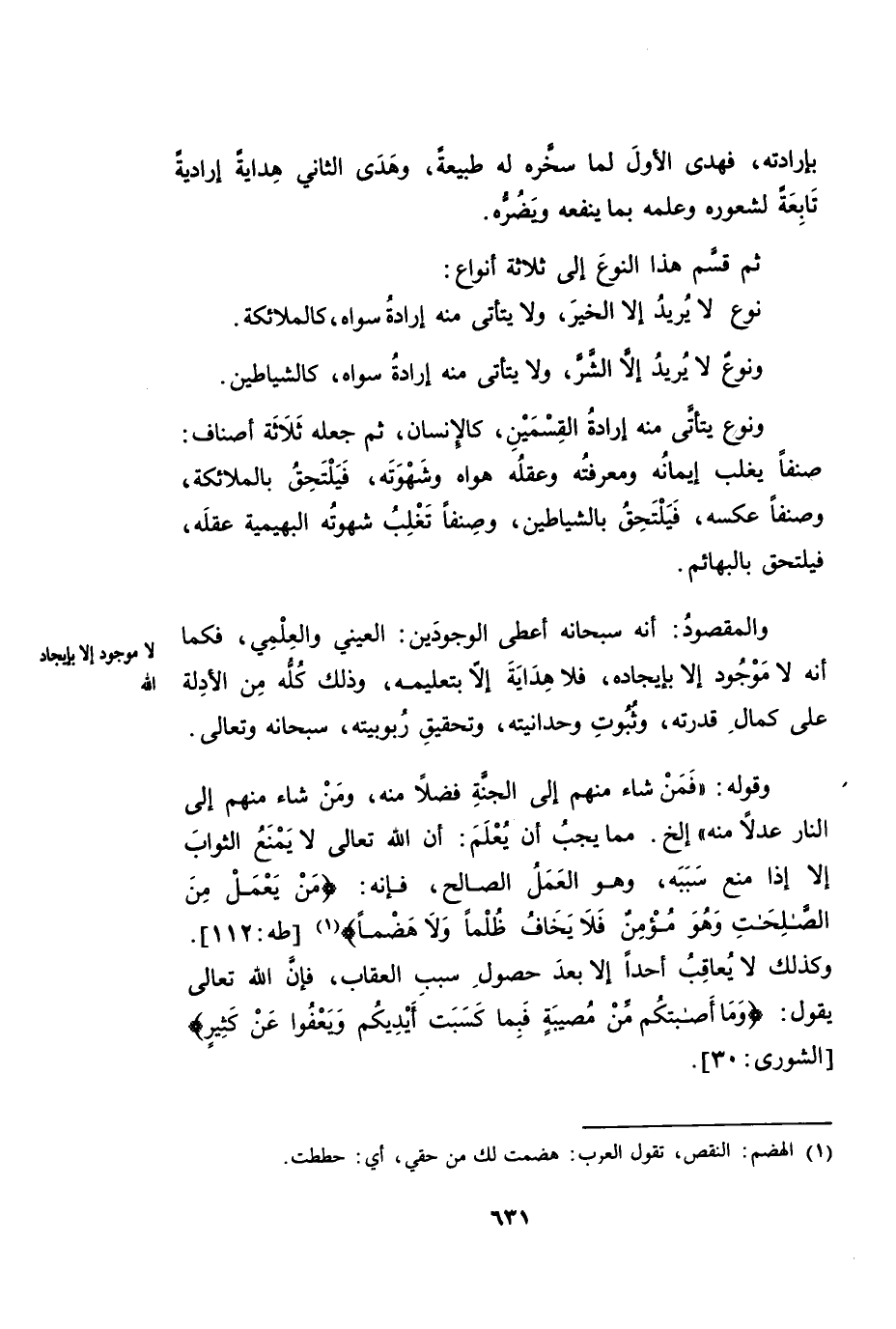 وَنَوْعٌ يَتَأَتَّى مِنْهُ إِرَادَةُ الْقِسْمَيْنِ، كَالْإِنْسَانِ. ثُمَّ جَعَلَهُ ثَلَاثَةَ أَصْنَافٍ: صِنْفًا يَغْلِبُ إِيمَانُهُ وَمَعْرِفَتُهُ وَعَقْلُهُ هَوَاهُ وَشَهْوَتَهُ، فَيَلْتَحِقُ بِالْمَلَائِكَةِ. وَصِنْفًا عَكْسُهُ، فَيَلْتَحِقُ بِالشَّيَاطِينِ. وَصِنْفًا تَغْلِبُ شَهْوَتُهُ الْبَهِيمِيَّةُ عَقْلَهُ، فَيَلْتَحِقُ بِالْبَهَائِمِ.