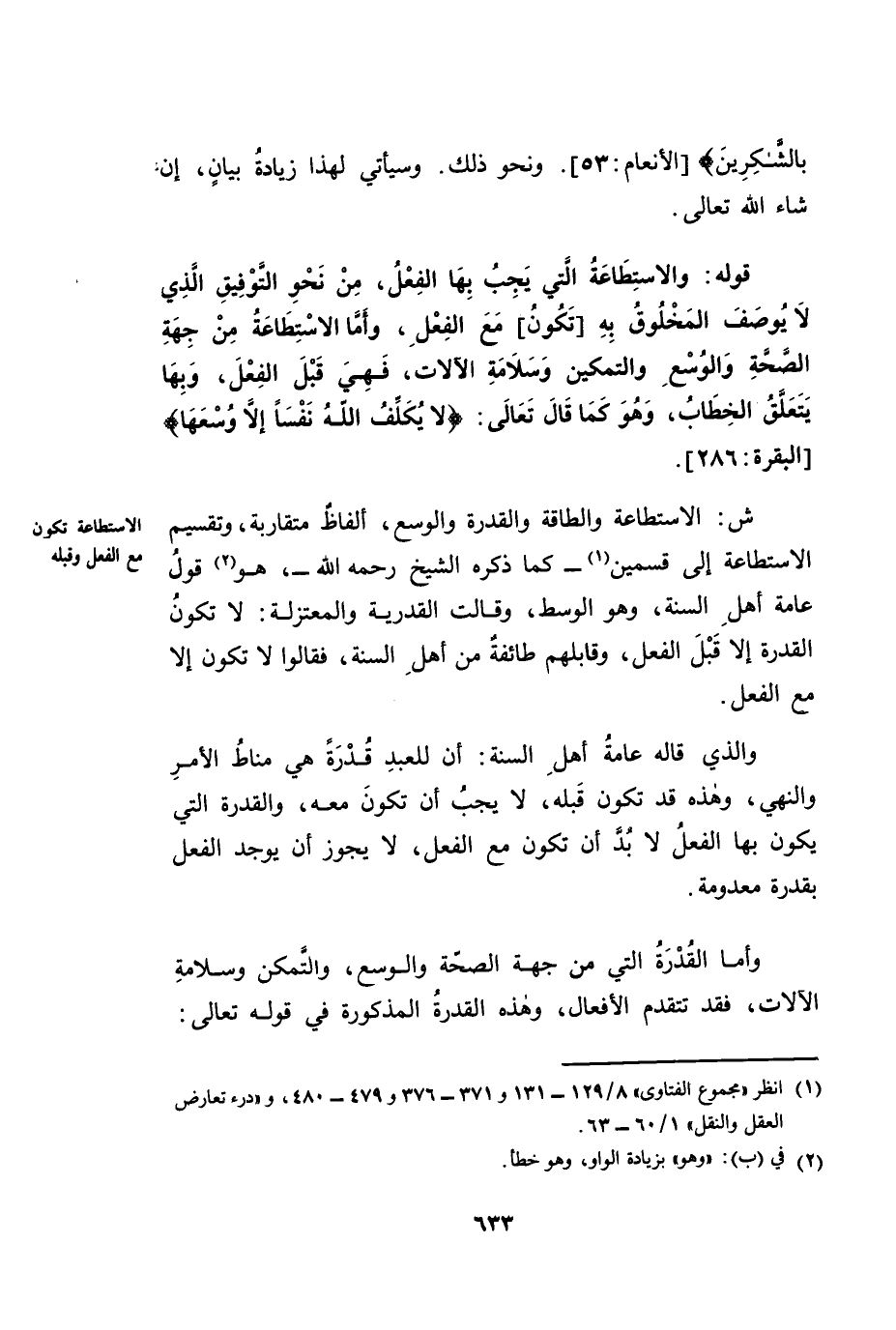 ش: الِاسْتِطَاعَةُ وَالطَّاقَةُ وَالْقُدْرَةُ وَالْوُسْعُ، أَلْفَاظٌ مُتَقَارِبَةٌ. وَتَنْقَسِمُ الِاسْتِطَاعَةُ إِلَى قِسْمَيْنِ، كَمَا ذَكَرَهُ الشَّيْخُ رَحِمَهُ اللَّهُ، وَهُوَ قَوْلُ عَامَّةِ أَهْلِ السُّنَّةِ، وَهُوَ الْوَسَطُ. وَقَالَتِ الْقَدَرِيَّةُ وَالْمُعْتَزِلَةُ: لَا تَكُونُ الْقُدْرَةُ إِلَّا قَبْلَ الْفِعْلِ. وَقَابَلَهُمْ طَائِفَةٌ مِنْ أَهْلِ السُّنَّةِ [فَقَالُوا لَا تَكُونُ إِلَّا مَعَ الْفِعْلِ.