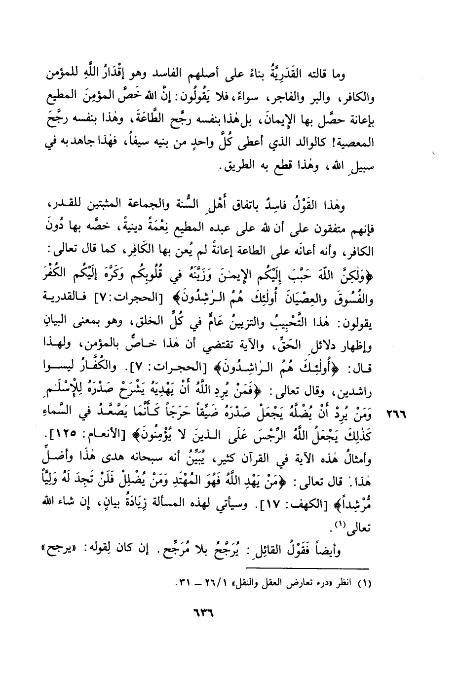 وَهَذَا الْقَوْلُ فَاسِدٌ بِاتِّفَاقِ أَهْلِ السُّنَّةِ وَالْجَمَاعَةِ الْمُثْبِتِينَ لِلْقَدَرِ، فَإِنَّهُمْ مُتَّفِقُونَ عَلَى أَنَّ لِلَّهِ عَلَى عَبْدِهِ الْمُطِيعِ نِعْمَةً دِينِيَّةً، خَصَّهُ بِهَا دُونَ الْكَافِرِ، وَأَنَّهُ أَعَانَهُ عَلَى الطَّاعَةِ إِعَانَةً لَمْ يُعِنْ بِهَا الْكَافِرَ. كَمَا قَالَ تَعَالَى: {وَلَكِنَّ اللَّهَ حَبَّبَ إِلَيْكُمُ الْإِيمَانَ وَزَيَّنَهُ فِي قُلُوبِكُمْ وَكَرَّهَ إِلَيْكُمُ الْكُفْرَ وَالْفُسُوقَ وَالْعِصْيَانَ أُولَئِكَ هُمُ الرَّاشِدُونَ} [الْحُجُرَاتِ: 7] فَالْقَدَرِيَّةُ يَقُولُونَ: إِنَّ هَذَا التَّحْبِيبَ وَالتَّزْيِينَ عَامٌّ فِي كُلِّ الْخَلْقِ، وَهُوَ بِمَعْنَى الْبَيَانِ وَإِظْهَارِ دَلَائِلِ الْحَقِّ. وَالْآيَةُ تَقْتَضِي أَنَّ هَذَا خَاصٌّ بِالْمُؤْمِنِ، وَلِهَذَا قَالَ: {أُولَئِكَ هُمُ الرَّاشِدُونَ} [الْحُجُرَاتِ: 7] . وَالْكُفَّارُ لَيْسُوا رَاشِدِينَ. وَقَالَ تَعَالَى: {فَمَنْ يُرِدِ اللَّهُ أَنْ يَهدِيَهُ يَشْرَحْ صَدْرَهُ لِلْإِسْلَامِ وَمَنْ يُرِدْ أَنْ يُضِلَّهُ يَجْعَلْ صَدْرَهُ ضَيِّقًا حَرَجًا كَأَنَّمَا يَصَّعَّدُ فِي السَّمَاءِ كَذَلِكَ يَجْعَلُ اللَّهُ الرِّجْسَ عَلَى الَّذِينَ لَا يُؤْمِنُونَ} [الْأَنْعَامِ: 125] . وَأَمْثَالُ هَذِهِ الْآيَةِ فِي الْقُرْآنِ كَثِيرٌ، يُبَيِّنُ أَنَّهُ سُبْحَانَهُ هَدَى هَذَا وَأَضَلَّ هَذَا. قَالَ تَعَالَى: {مَنْ يَهْدِ اللَّهُ فَهُوَ الْمُهْتَدِ وَمَنْ يُضْلِلْ فَلَنْ تَجِدَ لَهُ وَلِيًّا مُرْشِدًا} [الْكَهْفِ: 17] . وَسَيَأْتِي لِهَذِهِ الْمَسْأَلَةِ زِيَادَةُ بَيَانٍ، إِنْ شَاءَ اللَّهُ تَعَالَى.