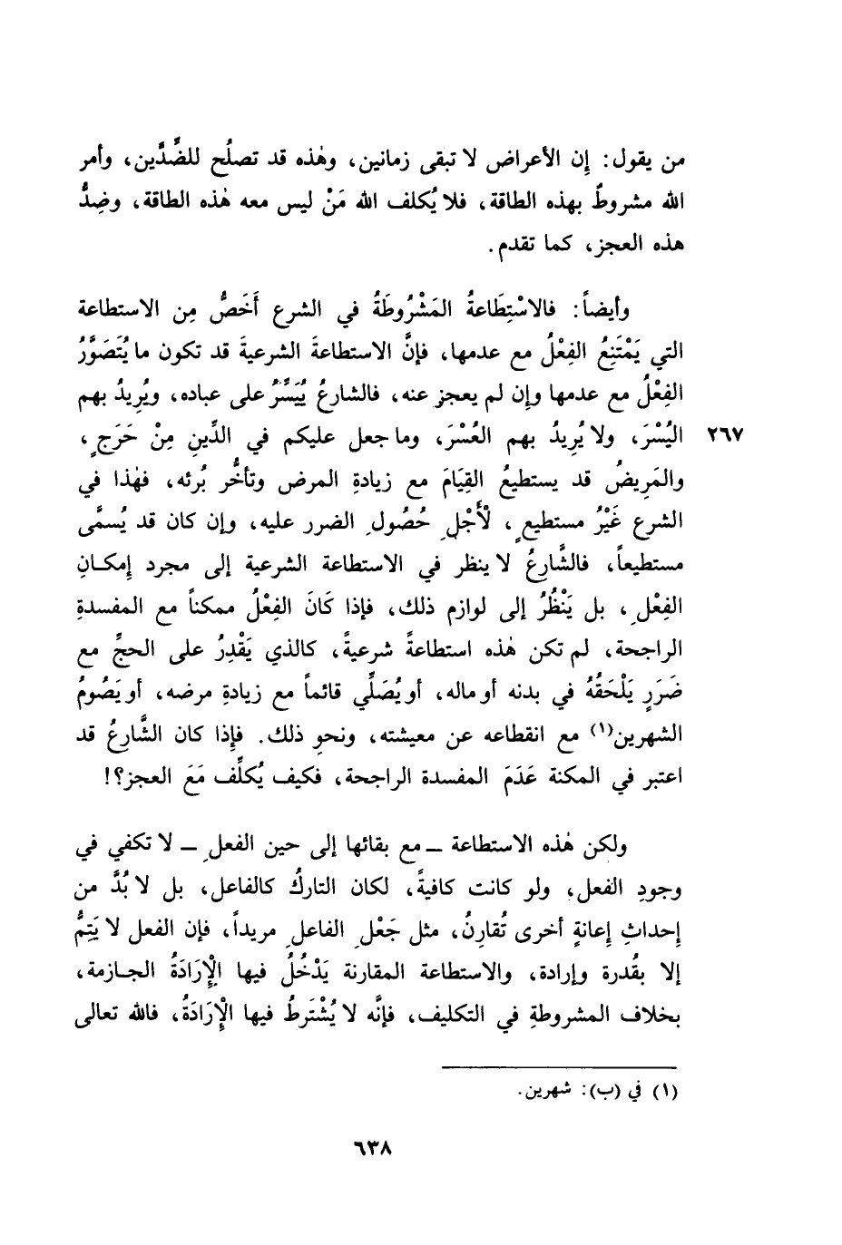 وَأَيْضًا: فَالِاسْتِطَاعَةُ الْمَشْرُوطَةُ فِي الشَّرْعِ أَخَصُّ مِنَ الِاسْتِطَاعَةِ الَّتِي يَمْتَنِعُ الْفِعْلُ مَعَ عَدَمِهَا، فَإِنَّ الِاسْتِطَاعَةَ الشَّرْعِيَّةَ قَدْ تَكُونُ مَا يُتَصَوَّرُ الْفِعْلُ مَعَ عَدَمِهَا وَإِنْ لَمْ يَعْجَزْ عَنْهُ. فَالشَّارِعُ يُيَسِّرُ عَلَى عِبَادِهِ، وَيُرِيدُ بِهِمُ الْيُسْرَ وَلَا يُرِيدُ بِهِمُ الْعُسْرَ، وَمَا جَعَلَ عَلَيْكُمْ فِي الدِّينِ مِنْ حَرَجٍ، وَالْمَرِيضُ قَدْ يَسْتَطِيعُ الْقِيَامَ مَعَ زِيَادَةِ الْمَرَضِ وَتَأَخُّرِ بُرْئِهِ، فَهَذَا فِي الشَّرْعِ غَيْرُ مُسْتَطِيعٍ، لِأَجْلِ حُصُولِ الضَّرَرِ عَلَيْهِ، وَإِنْ كَانَ قَدْ يُسَمَّى مُسْتَطِيعًا. فَالشَّارِعُ لَا يَنْظُرُ فِي الِاسْتِطَاعَةِ الشَّرْعِيَّةِ إِلَى مُجَرَّدِ إِمْكَانِ الْفِعْلِ، بَلْ يَنْظُرُ إِلَى لَوَازِمِ ذَلِكَ، فَإِنْ كَانَ الْفِعْلُ مُمْكِنًا مَعَ الْمَفْسَدَةِ الرَّاجِحَةِ لَمْ تَكُنْ هَذِهِ اسْتِطَاعَةٌ شَرْعِيَّةٌ، كَالَّذِي يَقْدِرُ عَلَى الْحَجِّ مَعَ ضَرَرٍ يَلْحَقُهُ فِي بَدَنِهِ أَوْ مَالِهِ، أَوْ يُصَلِّي قَائِمًا مَعَ زِيَادَةِ مَرَضِهِ، أَوْ يَصُومُ الشَّهْرَيْنِ مَعَ انْقِطَاعِهِ عَنْ مَعِيشَتِهِ، وَنَحْوِ ذَلِكَ. فَإِذَا كَانَ الشَّارِعُ قَدِ اعْتَبَرَ فِي الْمُكْنَةِ عَدَمَ الْمَفْسَدَةِ الرَّاجِحَةِ، فَكَيْفَ يُكَلِّفُ مَعَ الْعَجْزِ؟ !