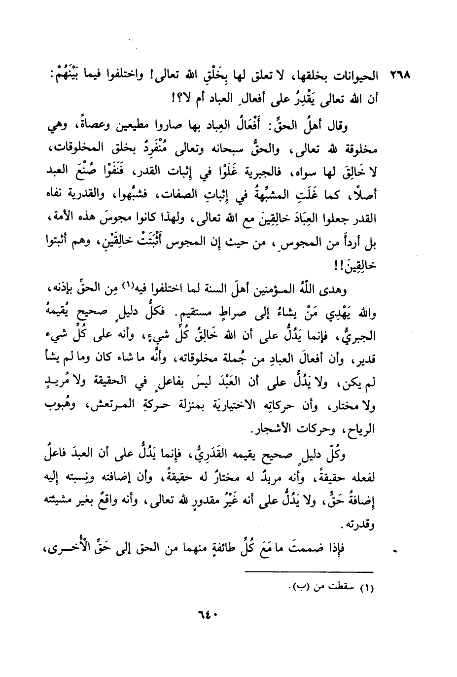 وَهَدَى اللَّهُ الْمُؤْمِنِينَ أَهْلَ السُّنَّةِ لِمَا اخْتَلَفُوا فِيهِ مِنَ الْحَقِّ بِإِذْنِهِ، وَاللَّهُ يَهْدِي مَنْ يَشَاءُ إِلَى صِرَاطٍ مُسْتَقِيمٍ. فَكُلُّ دَلِيلٍ صَحِيحٍ يُقِيمُهُ الْجَبْرِيُّ، فَإِنَّمَا يَدُلُّ عَلَى أَنَّ اللَّهَ خَالِقُ كُلِّ شَيْءٍ، وَأَنَّهُ عَلَى كُلِّ شَيْءٍ قَدِيرٌ، وَأَنَّ أَفْعَالَ الْعِبَادِ مِنْ جُمْلَةِ مَخْلُوقَاتِهِ، وَأَنَّهُ مَا شَاءَ كَانَ وَمَا لَمْ يَشَأْ لَمْ يَكُنْ، وَلَا يَدُلُّ عَلَى أَنَّ الْعَبْدَ لَيْسَ بِفَاعِلٍ فِي الْحَقِيقَةِ وَلَا مُرِيدٍ وَلَا مُخْتَارٍ، وَأَنَّ حَرَكَاتِهِ الِاخْتِيَارِيَّةَ بِمَنْزِلَةِ حَرَكَةِ الْمُرْتَعِشِ وَهُبُوبِ الرِّيَاحِ وَحَرَكَاتِ الْأَشْجَارِ.