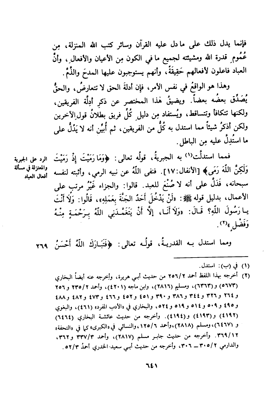 فَمِمَّا اسْتَدَلَّتْ بِهِ الْجَبْرِيَّةُ، قَوْلُهُ تَعَالَى: {وَمَا رَمَيْتَ إِذْ رَمَيْتَ وَلَكِنَّ اللَّهَ رَمَى} [الْأَنْفَالِ: 17] . فَنَفَى اللَّهُ عَنْ نَبِيِّهِ الرَّمْيَ، وَأَثْبَتَهُ لِنَفْسِهِ سُبْحَانَهُ، فَدَلَّ عَلَى أَنَّهُ لَا صُنْعَ لِلْعَبْدِ. قَالُوا: وَالْجَزَاءُ غَيْرُ مُرَتَّبٍ عَلَى الْأَعْمَالِ، بِدَلِيلِ قَوْلِهِ صَلَّى اللَّهُ عَلَيْهِ وَسَلَّمَ: «لَنْ يَدْخُلَ أَحَدٌ الْجَنَّةَ بِعَمَلِهِ، قَالُوا: وَلَا أَنْتَ يَا رَسُولَ اللَّهِ؟ قَالَ: وَلَا أَنَا، إِلَّا أَنْ يَتَغَمَّدَنِي اللَّهُ بِرَحْمَةٍ مِنْهُ وَفَضْلٍ» .