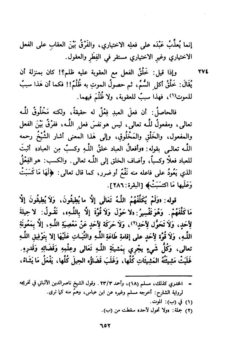 فَالْحَاصِلُ: أَنَّ فِعْلَ الْعَبْدِ فِعْلٌ لَهُ حَقِيقَةً، وَلَكِنَّهُ مَخْلُوقٌ لِلَّهِ تَعَالَى، وَمَفْعُولٌ لِلَّهِ تَعَالَى، لَيْسَ هُوَ نَفْسُ فِعْلِ اللَّهِ. فَفَرْقٌ بَيْنَ الْفِعْلِ وَالْمَفْعُولِ، وَالْخَلْقِ وَالْمَخْلُوقِ. وَإِلَى هَذَا الْمَعْنَى أَشَارَ الشَّيْخُ رَحِمَهُ اللَّهُ بِقَوْلِهِ: وَأَفْعَالُ الْعِبَادِ خَلْقُ اللَّهِ وَكَسْبٌ مِنَ الْعِبَادِ - أَثْبَتَ لِلْعِبَادِ فِعْلًا وَكَسْبًا، وَأَضَافَ الْخَلْقَ لِلَّهِ تَعَالَى. وَالْكَسْبُ: هُوَ الْفِعْلُ الَّذِي يَعُودُ عَلَى فَاعِلِهِ مِنْهُ نَفْعٌ أَوْ ضَرَرٌ، كَمَا قَالَ تَعَالَى: {لَهَا مَا كَسَبَتْ وَعَلَيْهَا مَا اكْتَسَبَتْ} [الْبَقَرَةِ: 286] .