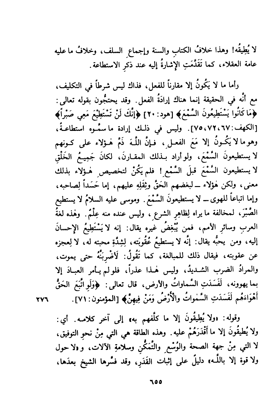 وَأَمَّا مَا لَا يَكُونُ إِلَّا مُقَارِنًا لِلْفِعْلِ، فَذَلِكَ لَيْسَ شَرْطًا فِي التَّكْلِيفِ، مَعَ أَنَّهُ فِي الْحَقِيقَةِ إِنَّمَا هُنَاكَ إِرَادَةُ الْفِعْلِ. وَقَدْ يَحْتَجُّونَ بِقَوْلِهِ تَعَالَى: " {مَا كَانُوا يَسْتَطِيعُونَ السَّمْعَ} [هُودٍ: 20] . {إِنَّكَ لَنْ تَسْتَطِيعَ مَعِيَ صَبْرًا} [الْكَهْفِ: 75] . وَلَيْسَ فِي ذَلِكَ إِرَادَةُ مَا سَمَّوْهُ اسْتِطَاعَةً، وَهُوَ مَا لَا يَكُونُ إِلَّا مَعَ الْفِعْلِ، فَإِنَّ اللَّهَ ذَمَّ هَؤُلَاءِ عَلَى كَوْنِهِمْ لَا يَسْتَطِيعُونَ السَّمْعَ، وَلَوْ أَرَادَ بِذَلِكَ الْمُقَارِنَ لَكَانَ جَمِيعُ الْخَلْقِ لَا يَسْتَطِيعُونَ السَّمْعَ قَبْلَ السَّمْعِ! فَلَمْ يَكُنْ لِتَخْصِيصِ هَؤُلَاءِ بِذَلِكَ مَعْنًى، وَلَكِنَّ هَؤُلَاءِ لِبُغْضِهِمُ الْحَقَّ وَثِقَلِهِ عَلَيْهِمْ، إِمَّا حَسَدًا لِصَاحِبِهِ، وَإِمَّا اتِّبَاعًا لِلْهَوَى - لَا يَسْتَطِيعُونَ السَّمْعَ. وَمُوسَى عَلَيْهِ السَّلَامُ لَا يَسْتَطِيعُ الصَّبْرَ، لِمُخَالَفَةِ مَا يَرَاهُ لِظَاهِرِ الشَّرْعِ، وَلَيْسَ عِنْدَهُ مِنْهُ عِلْمٌ. وَهَذِهِ لُغَةُ الْعَرَبِ وَسَائِرُ الْأُمَمِ، فَمَنْ يُبْغِضُ غَيْرَهُ يُقَالُ: إِنَّهُ لَا يَسْتَطِيعُ الْإِحْسَانَ إِلَيْهِ، وَمَنْ يُحِبُّهُ يُقَالُ: إِنَّهُ لَا يَسْتَطِيعُ عُقُوبَتَهُ، لِشِدَّةِ مَحَبَّتِهِ لَهُ، لَا لِعَجْزِهِ عَنْ عُقُوبَتِهِ، فَيُقَالُ ذَلِكَ لِلْمُبَالَغَةِ، كَمَا تَقُولُ: لَأَضْرِبَنَّهُ حَتَّى يَمُوتَ، وَالْمُرَادُ الضَّرْبُ الشَّدِيدُ. وَلَيْسَ هَذَا عُذْرًا، فَلَوْ لَمْ يَأْمُرِ الْعِبَادَ إِلَّا بِمَا يَهْوَوْنَهُ لَفَسَدَتِ السَّمَاوَاتُ وَالْأَرْضُ، قَالَ تَعَالَى: {وَلَوِ اتَّبَعَ الْحَقُّ أَهْوَاءَهُمْ لَفَسَدَتِ السَّمَاوَاتُ وَالْأَرْضُ وَمَنْ فِيهِنَّ} [الْمُؤْمِنُونَ: 71] .