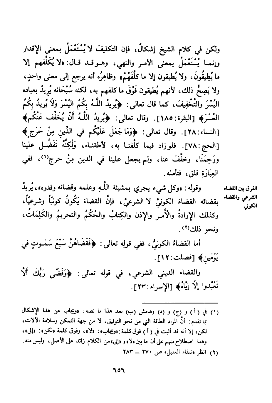 وَلَكِنْ فِي كَلَامِ الشَّيْخِ إِشْكَالٌ: فَإِنَّ التَّكْلِيفَ لَا يُسْتَعْمَلُ بِمَعْنَى الْإِقْدَارِ، وَإِنَّمَا يُسْتَعْمَلُ بِمَعْنَى الْأَمْرِ وَالنَّهْيِ، وَهُوَ قَدْ قَالَ: لَا يُكَلِّفُهُمْ إِلَّا مَا يُطِيقُونَ، وَلَا يُطِيقُونَ إِلَّا مَا كَلَّفَهُمْ. وَظَاهِرُهُ أَنَّهُ يَرْجِعُ إِلَى مَعْنًى وَاحِدٍ، وَلَا يَصِحُّ ذَلِكَ، لِأَنَّهُمْ يُطِيقُونَ فَوْقَ مَا كَلَّفَهُمْ بِهِ، لَكِنَّهُ سُبْحَانَهُ يُرِيدُ بِعِبَادِهِ الْيُسْرَ وَالتَّخْفِيفَ، كَمَا قَالَ تَعَالَى: {يُرِيدُ اللَّهُ بِكُمُ الْيُسْرَ وَلَا يُرِيدُ بِكُمُ الْعُسْرَ} [الْبَقَرَةِ: 185] . وَقَالَ تَعَالَى: {يُرِيدُ اللَّهُ أَنْ يُخَفِّفَ عَنْكُمْ} [النِّسَاءِ: 28] . وَقَالَ تَعَالَى: {وَمَا جَعَلَ عَلَيْكُمْ فِي الدِّينِ مِنْ حَرَجٍ} [الْحَجِّ: 78] . فَلَوْ زَادَ فِيمَا كَلَّفَنَا بِهِ لَأَطَقْنَاهُ، وَلَكِنَّهُ تَفَضَّلَ عَلَيْنَا وَرَحِمَنَا، وَخَفَّفَ عَنَّا، وَلَمْ يَجْعَلْ عَلَيْنَا فِي الدِّينِ مِنْ حَرَجٍ. فَفِي الْعِبَارَةِ قَلَقٌ، فَتَأَمَّلْهُ.