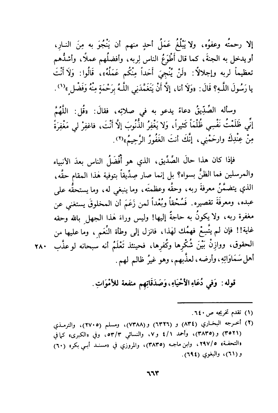 فَإِذَا كَانَ هَذَا حَالُ الصِّدِّيقِ، الَّذِي هُوَ أَفْضَلُ النَّاسِ بَعْدَ الْأَنْبِيَاءِ وَالْمُرْسَلِينَ - فَمَا الظَّنُّ بِسِوَاهُ؟ بَلْ إِنَّمَا صَارَ صِدِّيقًا بِتَوْفِيَتِهِ هَذَا الْمَقَامَ حَقَّهُ، الَّذِي يَتَضَمَّنُ مَعْرِفَةَ رَبِّهِ، وَحَقَّهُ وَعَظَمَتَهُ، وَمَا يَنْبَغِي لَهُ، وَمَا يَسْتَحِقُّهُ عَلَى عَبْدِهِ، وَمَعْرِفَةَ تَقْصِيرِهِ. فَسُحْقًا وَبُعْدًا لِمَنْ زَعَمَ أَنَّ الْمَخْلُوقَ يَسْتَغْنِي عَنْ مَغْفِرَةِ رَبِّهِ وَلَا يَكُونُ بِهِ حَاجَةٌ إِلَيْهَا! وَلَيْسَ وَرَاءَ هَذَا الْجَهْلِ بِاللَّهِ وَحَقِّهِ غَايَةٌ! ! فَإِنْ لَمْ يَتَّسِعْ فَهْمُكَ لِهَذَا، فَانْزِلْ إِلَى وَطْأَةِ النِّعَمِ، وَمَا عَلَيْهَا مِنَ الْحُقُوقِ، وَوَازِنْ مِنْ شُكْرِهَا وَكُفْرِهَا، فَحِينَئِذٍ تَعْلَمُ أَنَّهُ سُبْحَانَهُ لَوْ عَذَّبَ أَهْلَ سَمَاوَاتِهِ وَأَرْضِهِ، لَعَذَّبَهُمْ وَهُوَ غَيْرُ ظَالِمٍ لَهُمْ.