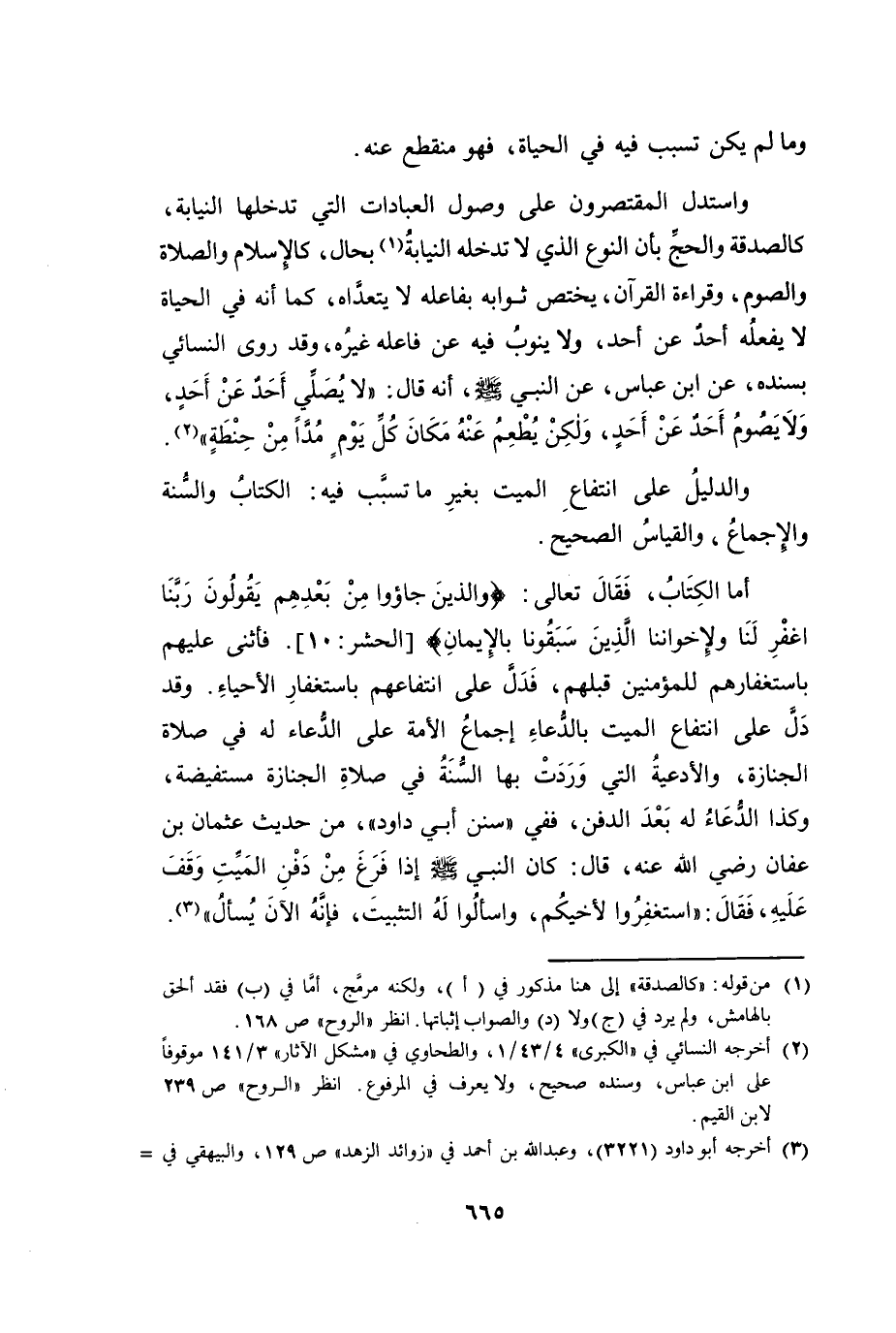 وَاسْتَدَلَّ الْمُقْتَصِرُونَ عَلَى وُصُولِ الْعِبَادَاتِ الَّتِي تَدْخُلُهَا النِّيَابَةُ، كَالصَّدَقَةِ وَالْحَجِّ بِأَنَّ النَّوْعَ الَّذِي لَا تَدْخُلُهُ النِّيَابَةُ بِحَالٍ، كَالْإِسْلَامِ وَالصَّلَاةِ وَالصَّوْمِ وَقِرَاءَةِ الْقُرْآنِ، يَخْتَصُّ ثَوَابُهُ بِفَاعِلِهِ لَا يَتَعَدَّاهُ، كَمَا أَنَّهُ فِي الْحَيَاةِ لَا يَفْعَلُهُ أَحَدٌ عَنْ أَحَدٍ، وَلَا يَنُوبُ فِيهِ عَنْ فَاعِلِهِ غَيْرُهُ - وَقَدْ رَوَى النَّسَائِيُّ بِسَنَدِهِ، عَنِ ابْنِ عَبَّاسٍ، عَنِ النَّبِيِّ صَلَّى اللَّهُ عَلَيْهِ وَسَلَّمَ، أَنَّهُ قَالَ: «لَا يُصَلِّي أَحَدٌ عَنْ أَحَدٍ، وَلَا يَصُومُ أَحَدٌ عَنْ أَحَدٍ، وَلَكِنْ يُطْعِمُ عَنْهُ مَكَانَ كُلِّ يَوْمٍ مُدًّا مِنْ حِنْطَةٍ» .