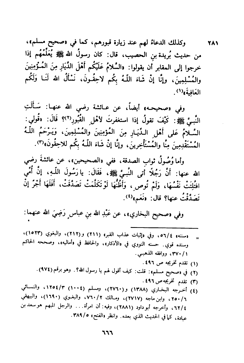 وَكَذَلِكَ الدُّعَاءُ لَهُمْ عِنْدَ زِيَارَةِ قُبُورِهِمْ، كَمَا فِي صَحِيحِ مُسْلِمٍ، مِنْ حَدِيثِ بُرَيْدَةَ بْنِ الْحَصِيبِ، قَالَ: «كَانَ رَسُولُ اللَّهِ صَلَّى اللَّهُ عَلَيْهِ وَسَلَّمَ يُعَلِّمُهُمُ إِذَا خَرَجُوا إِلَى الْمَقَابِرِ أَنْ يَقُولُوا: السَّلَامُ عَلَيْكُمْ أَهْلَ الدِّيَارِ مِنَ الْمُؤْمِنِينَ وَالْمُسْلِمِينَ، وَإِنَّا إِنْ شَاءَ اللَّهُ بِكُمْ لَاحِقُونَ، نَسْأَلُ اللَّهَ لَنَا وَلَكُمُ الْعَافِيَةَ» . وَفِي صَحِيحِ مُسْلِمٍ أَيْضًا، عَنْ عَائِشَةَ رَضِيَ اللَّهُ عَنْهَا: «سَأَلَتِ النَّبِيَّ صَلَّى اللَّهُ عَلَيْهِ وَسَلَّمَ: كَيْفَ تَقُولُ إِذَا اسْتَغْفَرَتْ لِأَهْلِ الْقُبُورِ؟ قَالَ: قُولِي: السَّلَامُ عَلَى أَهْلِ الدِّيَارِ مِنَ الْمُؤْمِنِينَ وَالْمُسْلِمِينَ، وَيَرْحَمُ اللَّهُ الْمُسْتَقْدِمِينَ مِنَّا وَالْمُسْتَأْخِرِينَ، وَإِنَّا إِنْ شَاءَ اللَّهُ بِكُمْ لَلَاحِقُونَ» .