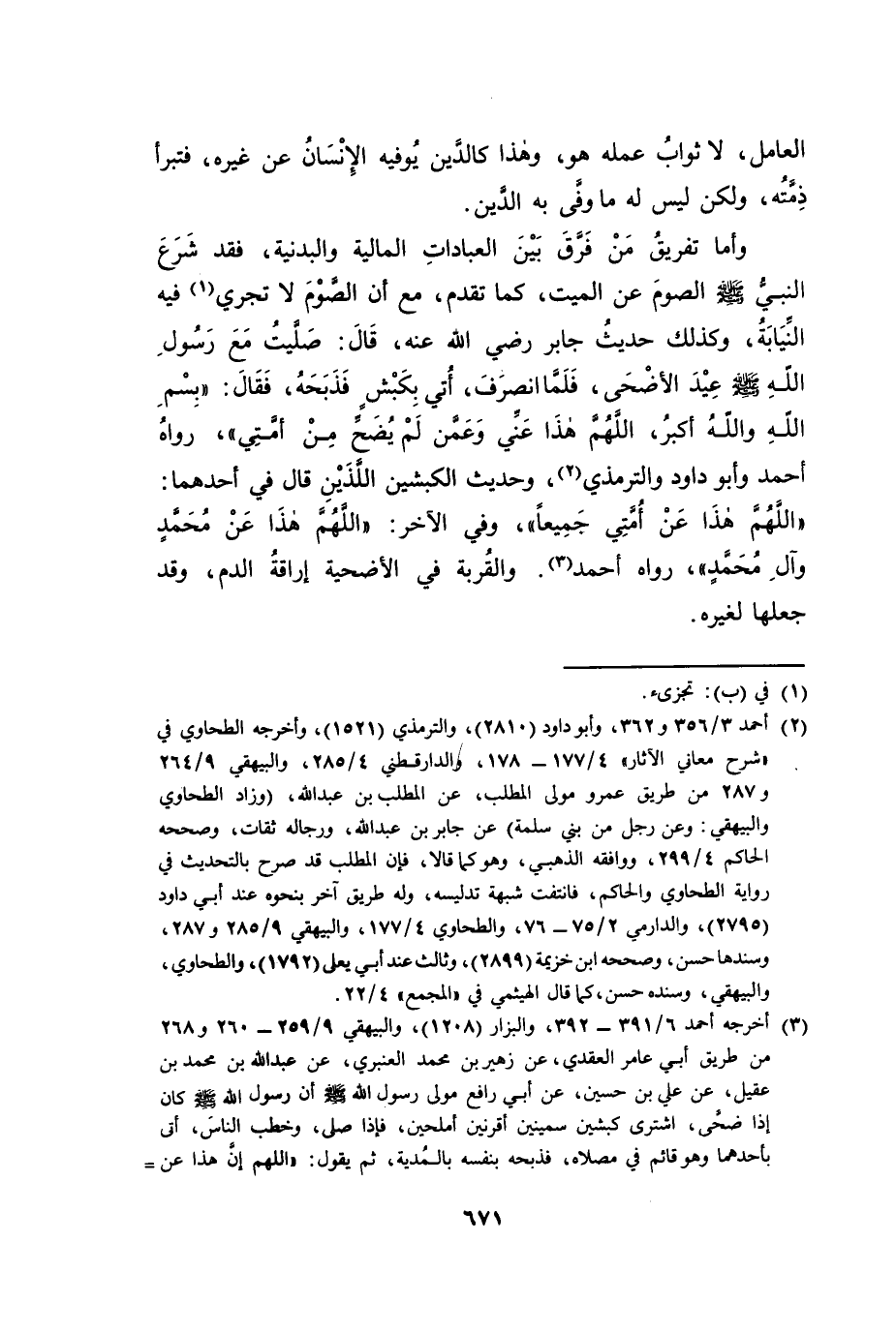 وَأَمَّا تَفْرِيقُ مَنْ فَرَّقَ بَيْنَ الْعِبَادَاتِ الْمَالِيَّةِ وَالْبَدَنِيَّةِ - فَقَدْ شَرَعَ النَّبِيُّ صَلَّى اللَّهُ عَلَيْهِ وَسَلَّمَ الصَّوْمَ عَنِ الْمَيِّتِ، كَمَا تَقَدَّمَ، مَعَ أَنَّ الصَّوْمَ لَا تُجْزِئُ فِيهِ النِّيَابَةُ، وَكَذَلِكَ حَدِيثُ جَابِرٍ رَضِيَ اللَّهُ عَنْهُ، قَالَ: «صَلَّيْتُ مَعَ رَسُولِ اللَّهِ صَلَّى اللَّهُ عَلَيْهِ وَسَلَّمَ عِيدَ الْأَضْحَى، فَلَمَّا انْصَرَفَ أَتَى بِكَبْشٍ فَذَبَحَهُ، فَقَالَ: بِسْمِ اللَّهِ وَاللَّهُ أَكْبَرُ، اللَّهُمَّ هَذَا عَنِّي وَعَمَّنْ لَمْ يُضَحِّ مِنْ أُمَّتِي» ، رَوَاهُ أَحْمَدُ وَأَبُو دَاوُدَ وَالتِّرْمِذِيُّ، وَحَدِيثُ الْكَبْشَيْنِ اللَّذَيْنِ قَالَ فِي أَحَدِهِمَا: «اللَّهُمَّ هَذَا عَنْ أُمَّتِي جَمِيعًا» ، وَفِي الْآخَرِ: «اللَّهُمَّ هَذَا عَنْ مُحَمَّدٍ وَآلِ مُحَمَّدٍ» ، رَوَاهُ أَحْمَدُ. وَالْقُرْبَةُ فِي الْأُضْحِيَّةِ إِرَاقَةُ الدَّمِ، وَقَدْ جَعَلَهَا لِغَيْرِهِ.
