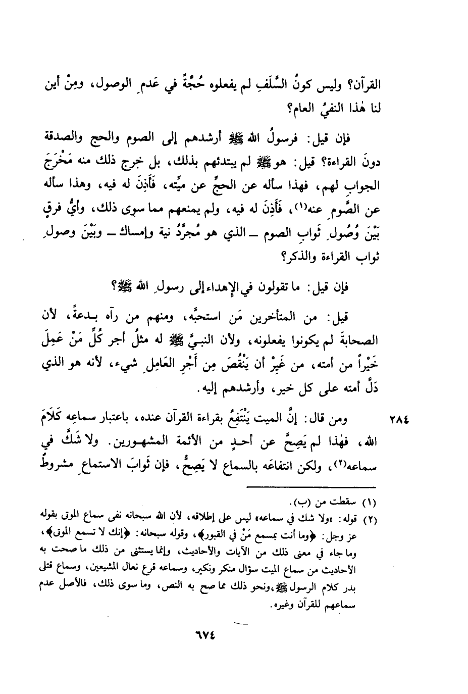 فَإِنْ قِيلَ: فَرَسُولُ اللَّهِ صَلَّى اللَّهُ عَلَيْهِ وَسَلَّمَ أَرْشَدَهُمْ إِلَى الصَّوْمِ وَالْحَجِّ وَالصَّدَقَةِ دُونَ الْقِرَاءَةِ؟ قِيلَ: هُوَ صَلَّى اللَّهُ عَلَيْهِ وَسَلَّمَ لَمْ يَبْتَدِئْهُمْ بِذَلِكَ، بَلْ خَرَجَ ذَلِكَ مِنْهُ مَخْرَجَ الْجَوَابِ لَهُمْ، فَهَذَا سَأَلَهُ عَنِ الْحَجِّ عَنْ مَيِّتِهِ فَأَذِنَ لَهُ فِيهِ، وَهَذَا سَأَلَهُ عَنِ الصَّوْمِ عَنْهُ، فَأَذِنَ لَهُ فِيهِ، وَلَمْ يَمْنَعْهُمْ مِمَّا سِوَى ذَلِكَ، وَأَيُّ فَرْقٍ بَيْنَ وُصُولِ ثَوَابِ الصَّوْمِ - الَّذِي هُوَ مُجَرَّدُ نِيَّةٍ وَإِمْسَاكٍ - وَبَيْنَ وُصُولِ ثَوَابِ الْقِرَاءَةِ وَالذِّكْرِ؟
