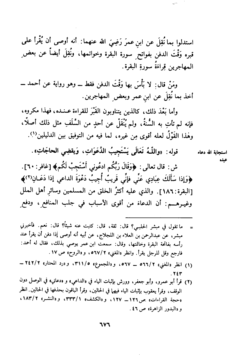 ش: قَالَ تَعَالَى: " {وَقَالَ رَبُّكُمُ ادْعُونِي أَسْتَجِبْ لَكُمْ} [غَافِرٍ: 60] . {وَإِذَا سَأَلَكَ عِبَادِي عَنِّي فَإِنِّي قَرِيبٌ أُجِيبُ دَعْوَةَ الدَّاعِ إِذَا دَعَانِ} [الْبَقَرَةِ: 186] . وَالَّذِي عَلَيْهِ أَكْثَرُ الْخَلْقِ مِنَ الْمُسْلِمِينَ وَسَائِرِ أَهْلِ الْمِلَلِ وَغَيْرِهِمْ -: أَنَّ الدُّعَاءَ مِنْ أَقْوَى الْأَسْبَابِ فِي جَلْبِ الْمَنَافِعِ وَدَفْعِ الْمَضَارِّ، وَقَدْ أَخْبَرَ تَعَالَى عَنِ الْكُفَّارِ أَنَّهُمْ إِذَا مَسَّهُمُ الضُّرُّ فِي الْبَحْرِ