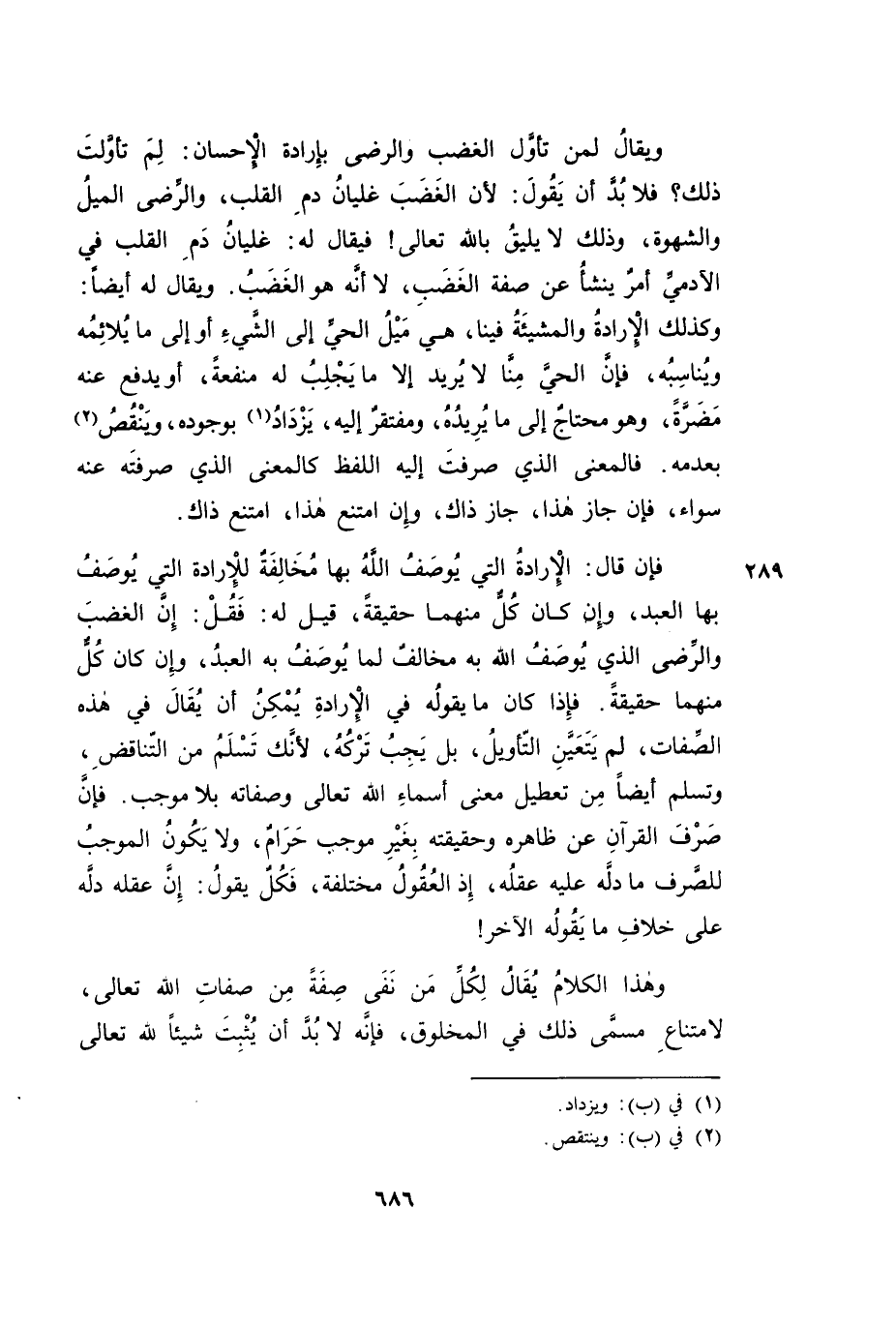 وَيُقَالُ لِمَنْ تَأَوَّلَ الْغَضَبَ وَالرِّضَى بِإِرَادَةِ الْإِحْسَانِ: لِمَ تَأَوَّلْتَ ذَلِكَ؟ فَلَابُدَّ أَنْ يَقُولَ: لِأَنَّ الْغَضَبَ غَلَيَانُ دَمِ الْقَلْبِ، وَالرِّضَى الْمَيْلُ وَالشَّهْوَةُ، وَذَلِكَ لَا يَلِيقُ بِاللَّهِ تَعَالَى! فَيُقَالُ لَهُ: غَلَيَانُ دَمِ الْقَلْبِ فِي الْآدَمِيِّ أَمْرٌ يَنْشَأُ عَنْ صِفَةِ الْغَضَبِ، لَا أَنَّهُ الْغَضَبُ. وَيُقَالُ لَهُ أَيْضًا: وَكَذَلِكَ الْإِرَادَةُ وَالْمَشِيئَةُ فِينَا، فَهِيَ مَيْلُ الْحَيِّ إِلَى الشَّيْءِ أَوْ إِلَى مَا يُلَائِمُهُ وَيُنَاسِبُهُ، فَإِنَّ الْحَيَّ مِنَّا لَا يُرِيدُ إِلَّا مَا يَجْلِبُ لَهُ مَنْفَعَةً أَوْ يَدْفَعُ عَنْهُ مَضَرَّةً، وَهُوَ مُحْتَاجٌ إِلَى مَا يُرِيدُهُ وَمُفْتَقِرٌ إِلَيْهِ، وَيَزْدَادُ بِوُجُودِهِ، وَيَنْتَقِصُ بِعَدَمِهِ. فَالْمَعْنَى الَّذِي صَرَفْتَ إِلَيْهِ اللَّفْظَ كَالْمَعْنَى الَّذِي صَرَفْتَهُ عَنْهُ سَوَاءٌ، فَإِنْ جَازَ هَذَا جَازَ ذَاكَ، وَإِنِ امْتَنَعَ هَذَا امْتَنَعَ ذَاكَ.