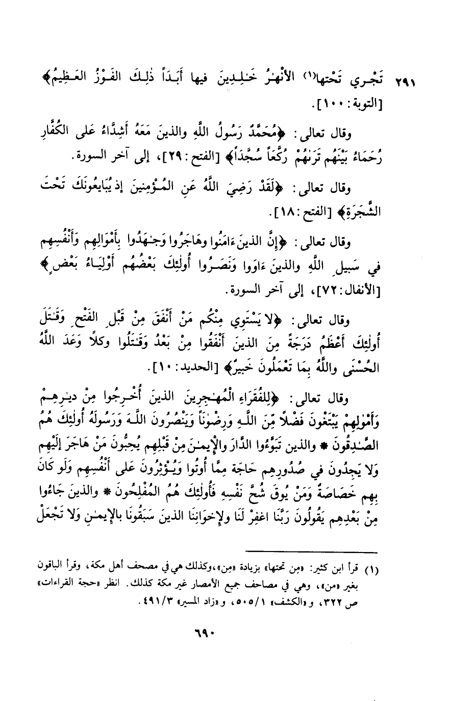 وَقَالَ تَعَالَى: {لِلْفُقَرَاءِ الْمُهَاجِرِينَ الَّذِينَ أُخْرِجُوا مِنْ دِيارِهِمْ وَأَمْوَالِهِمْ يَبْتَغُونَ فَضْلًا مِنَ اللَّهِ وَرِضْوَانًا وَيَنْصُرُونَ اللَّهَ وَرَسُولَهُ أُولَئِكَ هُمُ الصَّادِقُونَ - وَالَّذِينَ تَبَوَّءُوا الدَّارَ وَالْإِيمَانَ مِنْ قَبْلِهِمْ يُحِبُّونَ مَنْ هَاجَرَ إِلَيْهِمْ وَلَا يَجِدُونَ فِي صُدُورِهِمْ حَاجَةً مِمَّا أُوتُوا وَيُؤْثِرُونَ عَلَى أَنْفُسِهِمْ وَلَوْ كَانَ بِهِمْ خَصَاصَةٌ وَمَنْ يُوقَ شُحَّ نَفْسِهِ فَأُولَئِكَ هُمُ الْمُفْلِحُونَ - وَالَّذِينَ جَاءُوا مِنْ بَعْدِهِمْ يَقُولُونَ رَبَّنَا اغْفِرْ لَنَا وَلِإِخْوَانِنَا الَّذِينَ سَبَقُونَا بِالْإِيمَانِ وَلَا تَجْعَلْ فِي قُلُوبِنَا غِلًّا لِلَّذِينَ آمَنُوا رَبَّنَا إِنَّكَ رَءُوفٌ رَحِيمٌ} [الحشر: 8 - 10]