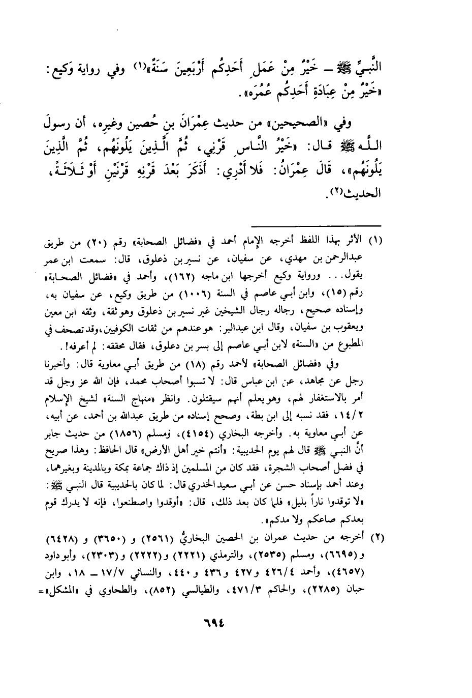 وَفِي الصَّحِيحَيْنِ مِنْ حَدِيثِ عِمْرَانَ بْنِ حُصَيْنٍ وَغَيْرِهِ، أَنَّ رَسُولَ اللَّهِ صَلَّى اللَّهُ عَلَيْهِ وَسَلَّمَ قَالَ: «خَيْرُ النَّاسِ قَرْنِي، ثُمَّ الَّذِينَ يَلُونَهُمْ، ثُمَّ الَّذِينَ يَلُونَهُمْ» ، قَالَ عِمْرَانُ: فَلَا أَدْرِي: أَذَكَرَ بَعْدَ قَرْنِهِ قَرْنَيْنِ أَوْ ثَلَاثَةً، الْحَدِيثَ.