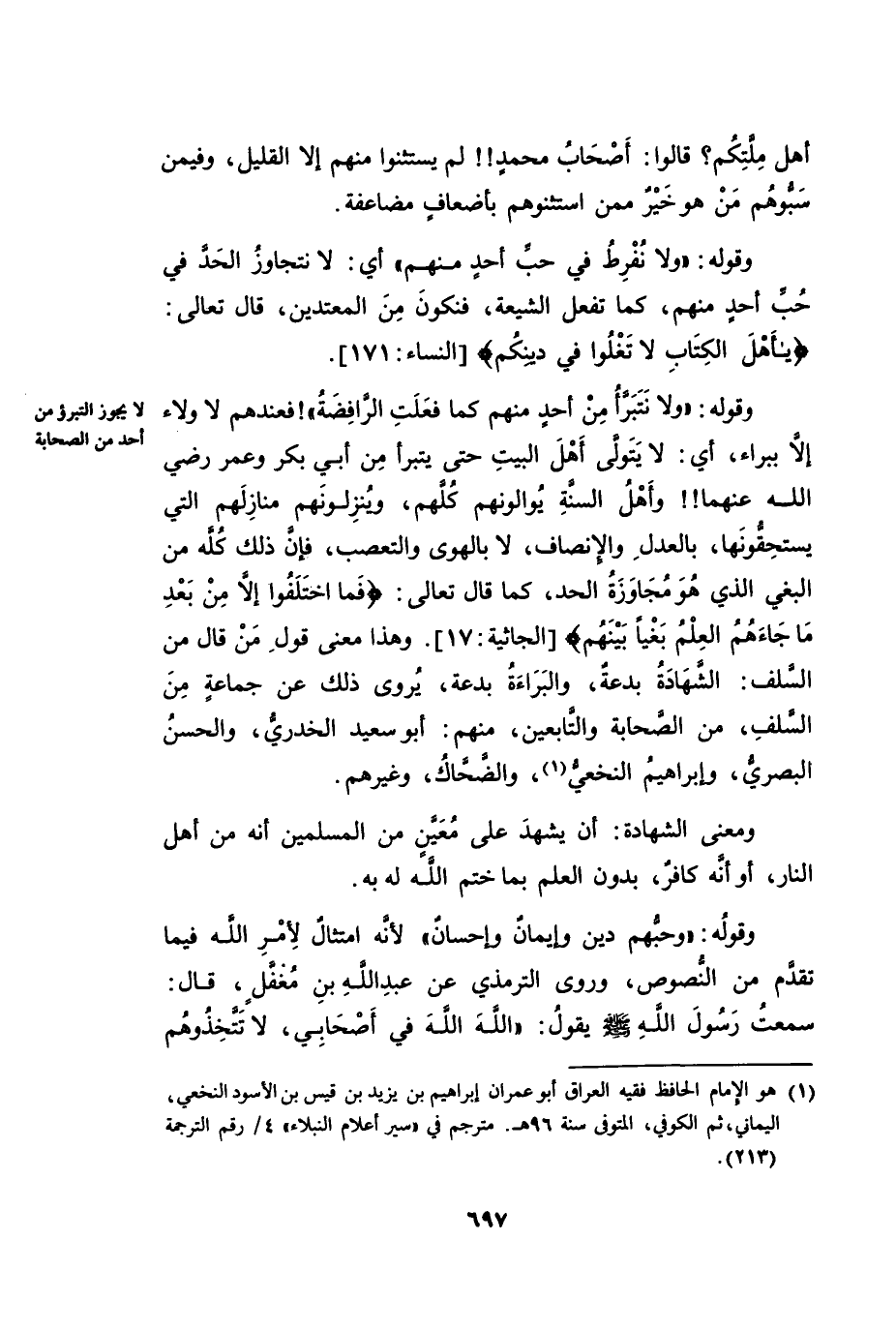 وَقَوْلُهُ: وَلَا نَتَبَرَّأُ مِنْ أَحَدٍ مِنْهُمْ - كَمَا فَعَلَتِ الرَّافِضَةُ! فَعِنْدَهُمْ لَا وَلَاءَ إِلَّا بِبَرَاءٍ، أَيْ لَا يَتَوَلَّى أَهْلَ الْبَيْتِ حَتَّى يَتَبَرَّأَ مِنْ أَبِي بَكْرٍ وَعُمَرَ رَضِيَ اللَّهُ عَنْهُمَا! ! وَأَهْلُ السُّنَّةِ يُوَالُونَهُمْ كُلَّهُمْ، وَيُنْزِلُونَهُمْ مَنَازِلَهُمِ الَّتِي يَسْتَحِقُّونَهَا، بِالْعَدْلِ وَالْإِنْصَافِ، لَا بِالْهَوَى وَالتَّعَصُّبِ. فَإِنَّ ذَلِكَ كُلَّهُ مِنَ الْبَغْيِ الَّذِي هُوَ مُجَاوَزَةُ الْحَدِّ، كَمَا قَالَ تَعَالَى: {فَمَا اخْتَلَفُوا إِلَّا مِنْ بَعْدِ مَا جَاءَهُمُ الْعِلْمُ بَغْيًا بَيْنَهُمْ} [الْجَاثِيَةِ: 17] . وَهَذَا مَعْنَى قَوْلِ مَنْ قَالَ مِنَ السَّلَفِ: الشَّهَادَةُ بِدْعَةٌ، وَالْبَرَاءَةُ بِدْعَةٌ. يُرْوَى ذَلِكَ عَنْ جَمَاعَةٍ مِنَ السَّلَفِ، مِنَ الصَّحَابَةِ وَالتَّابِعِينَ، مِنْهُمْ: أَبُو سَعِيدٍ الْخُدْرِيُّ، وَالْحَسَنُ الْبَصْرِيُّ، وَإِبْرَاهِيمُ النَّخَعِيُّ، وَالضَّحَاكُ، وَغَيْرُهُمْ.