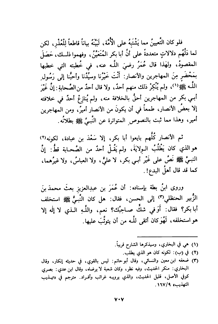 فَلَوْ كَانَ التَّعْيِينُ مِمَّا يَشْتَبِهُ عَلَى الْأُمَّةِ لَبَيَّنَهُ بَيَانًا قَاطِعًا لِلْعُذْرِ، لَكِنْ لَمَّا دَلَّهُمْ دَلَالَاتٍ مُتَعَدِّدَةٍ عَلَى أَنَّ أَبَا بَكْرٍ الْمُتَعَيِّنُ، وَفَهِمُوا ذَلِكَ - حَصَلَ الْمَقْصُودُ. وَلِهَذَا قَالَ عُمَرُ رَضِيَ اللَّهُ عَنْهُ، فِي خُطْبَتِهِ الَّتِي خَطَبَهَا بِمَحْضَرٍ مِنَ الْمُهَاجِرِينَ وَالْأَنْصَارِ: أَنْتَ خَيْرُنَا وَسَيِّدُنَا وَأَحَبُّنَا إِلَى رَسُولِ اللَّهِ صَلَّى اللَّهُ عَلَيْهِ وَسَلَّمَ، وَلَمْ يُنْكِرْ ذَلِكَ مِنْهُمْ أَحَدٌ، وَلَا قَالَ أَحَدٌ مِنَ الصَّحَابَةِ إِنَّ غَيْرَ أَبِي بَكْرٍ مِنَ الْمُهَاجِرِينَ أَحَقُّ بِالْخِلَافَةِ مِنْهُ، وَلَمْ يُنَازِعْ أَحَدٌ فِي خِلَافَتِهِ إِلَّا بَعْضُ الْأَنْصَارِ، طَمَعًا فِي أَنْ يَكُونَ مِنَ الْأَنْصَارِ أَمِيرٌ وَمِنَ الْمُهَاجِرِينَ أَمِيرٌ، وَهَذَا مِمَّا ثَبَتَ بِالنُّصُوصِ الْمُتَوَاتِرَةِ عَنِ النَّبِيِّ صَلَّى اللَّهُ عَلَيْهِ وَسَلَّمَ بُطْلَانُهُ.