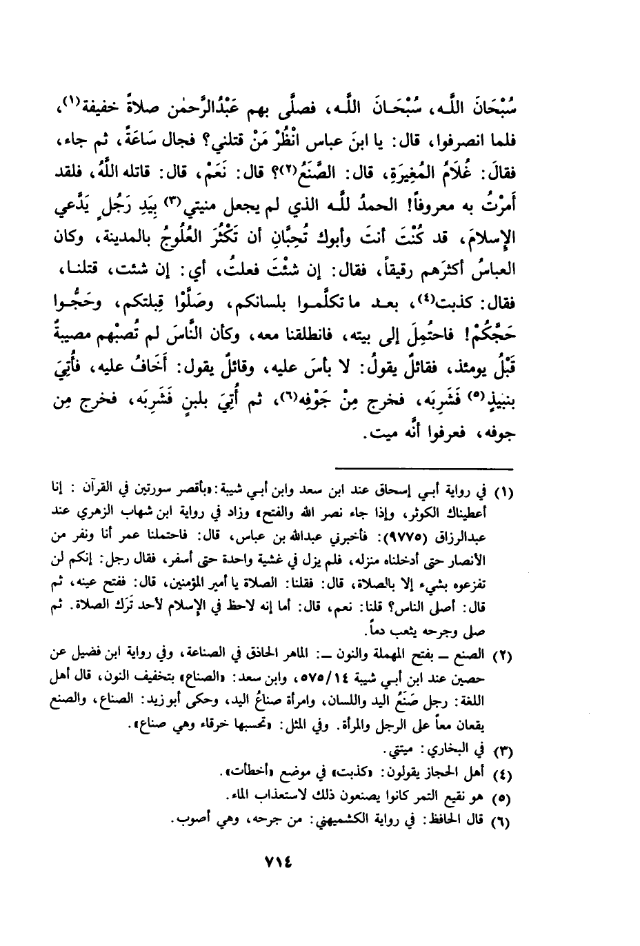 سُبْحَانَ اللَّهِ، سُبْحَانَ اللَّهِ، فَصَلَّى بِهِمْ عَبْدُ الرَّحْمَنِ صَلَاةً خَفِيفَةً، فَلَمَّا انْصَرَفُوا، قَالَ: يَا ابْنَ عَبَّاسٍ انْظُرْ مَنْ قَتَلَنِي؟ فَجَالَ سَاعَةً، ثُمَّ جَاءَ فَقَالَ: غُلَامُ الْمُغِيرَةِ، قَالَ: الصَّنَعُ؟ قَالَ: نَعَمْ، قَالَ: قَاتَلَهُ اللَّهُ! لَقَدْ أَمَرْتُ بِهِ مَعْرُوفًا! الْحَمْدُ لِلَّهِ الَّذِي لَمْ يَجْعَلْ مَنِيَّتِي عَلَى يَدِ رَجُلٍ يَدَّعِي الْإِسْلَامَ، قَدْ كُنْتَ أَنْتَ وَأَبُوكَ تُحِبَّانِ أَنْ تَكْثُرَ الْعُلُوجُ بِالْمَدِينَةِ، وَكَانَ الْعَبَّاسُ أَكْثَرُهُمْ رَقِيقًا، فَقَالَ: إِنْ شِئْتَ فَعَلْتُ؟ أَيْ: إِنْ شِئْتَ قَتَلْنَا؟ قَالَ: كَذَبْتَ! بَعْدَ مَا تَكَلَّمُوا بِلِسَانِكُمْ، وَصَلُّوا قِبْلَتَكُمْ، وَحَجُّوا حَجَّكُمْ؟ فَاحْتُمِلَ إِلَى بَيْتِهِ، فَانْطَلَقْنَا مَعَهُ، وَكَأَنَّ النَّاسَ لَمْ تُصِبْهُمْ مُصِيبَةٌ قَبْلَ يَوْمَئِذٍ، فَقَائِلٌ يَقُولُ: لَا بَأْسَ عَلَيْهِ، وَقَائِلٌ يَقُولُ: أَخَافُ عَلَيْهِ، فَأُتِيَ بِنَبِيذٍ فَشَرِبَهُ، فَخَرَجَ مِنْ جَوْفِهِ، ثُمَّ أُتِيَ بِلَبَنٍ فَشَرِبَهُ، فَخَرَجَ مِنْ جَوْفِهِ، فَعَرَفُوا أَنَّهُ مَيِّتٌ.