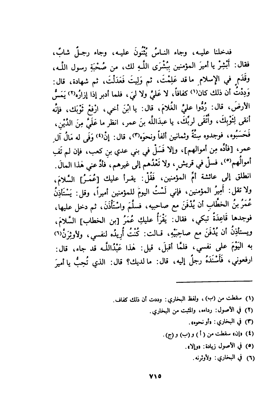 فَدَخَلْنَا عَلَيْهِ، وَجَاءَ النَّاسُ يُثْنُونَ عَلَيْهِ، وَجَاءَ رَجُلٌ شَابٌّ، فَقَالَ: أَبْشِرْ يَا أَمِيرَ الْمُؤْمِنِينَ بِبُشْرَى اللَّهِ لَكَ، مِنْ صُحْبَةِ رَسُولِ اللَّهِ صَلَّى اللَّهُ عَلَيْهِ وَسَلَّمَ، وَقَدَمٍ فِي الْإِسْلَامِ مَا قَدْ عَلِمْتَ، ثُمَّ وَلِيتَ فَعَدَلْتَ، ثُمَّ شَهَادَةٌ، قَالَ: وَدِدْتُ أَنَّ ذَلِكَ كَانَ كَفَافًا، لَا عَلَيَّ وَلَا لِيَ، فَلَمَّا أَدْبَرَ إِذَا إِزَارُهُ يَمَسُّ الْأَرْضَ، قَالَ: رَدُّوا عَلَيَّ الْغُلَامَ، قَالَ: يَا ابْنَ أَخِي، ارْفَعْ ثَوْبَكَ، فَإِنَّهُ أَنْقَى لِثَوْبِكَ، وَأَتْقَى لِرَبِّكَ، يَا عَبْدَ اللَّهِ بْنَ عُمَرَ، انْظُرْ مَا عَلَيَّ مِنَ الدَّيْنِ؟ فَحَسَبُوهُ، فَوَجَدُوهُ سِتَّةً وَثَمَانِينَ أَلْفًا وَنَحْوَهُ، قَالَ: إِنْ وَفَى لَهُ مَالُ آلِ عُمَرَ، فَأَدِّهِ مِنْ أَمْوَالِهِمْ، وَإِلَّا فَسَلْ فِي بَنِي عَدِيِّ بْنِ كَعْبٍ، فَإِنْ لَمْ تَفِ أَمْوَالُهُمْ، فَسَلْ فِي قُرَيْشٍ، وَلَا تَعْدُهُمْ إِلَى غَيْرِهِمْ، فَأَدِّ عَنِّي هَذَا الْمَالَ، انْطَلِقْ إِلَى عَائِشَةَ أُمِّ الْمُؤْمِنِينَ، فَقُلْ: يَقْرَأُ عَلَيْكِ عُمَرُ السَّلَامَ، وَلَا تَقُلْ: أَمِيرُ الْمُؤْمِنِينَ، فَإِنِّي لَسْتُ الْيَوْمَ لِلْمُؤْمِنِينَ أَمِيرًا، وَقُلْ: يَسْتَأْذِنُ عُمَرُ بْنُ الْخَطَّابِ أَنْ يُدْفَنَ مَعَ صَاحِبَيْهِ، فَسَلَّمَ وَاسْتَأْذَنَ، ثُمَّ دَخَلَ عَلَيْهَا، فَوَجَدَهَا قَاعِدَةً تَبْكِي، فَقَالَ: يَقْرَأُ عَلَيْكِ عُمَرُ [بْنُ الْخَطَّابِ] السَّلَامَ، وَيَسْتَأْذِنُ أَنْ يُدْفَنَ مَعَ صَاحِبَيْهِ، فَقَالَتْ: كُنْتُ أُرِيدُهُ لِنَفْسِي، وَلَأُوثِرَنَّ بِهِ الْيَوْمَ عَلَى نَفْسِي، فَلَمَّا أَقْبَلَ، قِيلَ: هَذَا عَبْدُ اللَّهِ قَدْ جَاءَ، قَالَ: ارْفَعُونِي، فَأَسْنَدَهُ رَجُلٌ إِلَيْهِ، قَالَ. مَا لَدَيْكَ؟ قَالَ. الَّذِي تُحِبُّ يَا أَمِيرَ