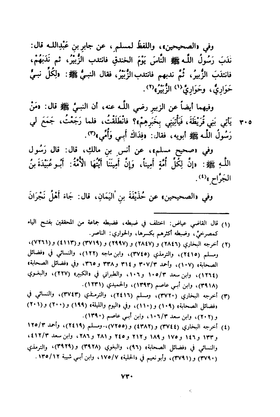 وَفِي الصَّحِيحَيْنِ، وَاللَّفْظُ لِمُسْلِمٍ، عَنْ جَابِرِ بْنِ عَبْدِ اللَّهِ قَالَ: «نَدَبَ رَسُولُ اللَّهِ صَلَّى اللَّهُ عَلَيْهِ وَسَلَّمَ النَّاسَ يَوْمَ الْخَنْدَقِ فَانْتَدَبَ الزُّبَيْرُ، ثُمَّ نَدَبَهُمْ، فَانْتَدَبَ الزُّبَيْرُ، ثُمَّ نَدَبَهُمْ، فَانْتَدَبَ الزُّبَيْرُ، فَقَالَ النَّبِيُّ صَلَّى اللَّهُ عَلَيْهِ وَسَلَّمَ: لِكُلِّ نَبِيٍّ حَوَارِيٌّ، وَحَوَارِيَّ الزُّبَيْرُ»