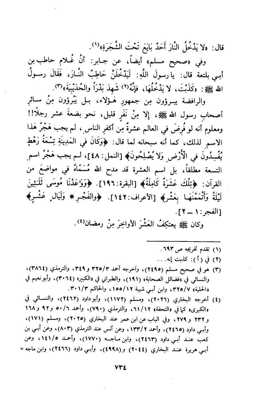 وَفِي صَحِيحِ مُسْلِمٍ أَيْضًا، عَنْ جَابِرٍ: أَنَّ غُلَامَ حَاطِبِ بْنِ أَبِي بَلْتَعَةَ قَالَ يَا رَسُولَ اللَّهِ: «لَيَدْخُلَنَّ حَاطِبٌ النَّارَ، فَقَالَ رَسُولُ اللَّهِ صَلَّى اللَّهُ عَلَيْهِ وَسَلَّمَ: كَذَبْتَ، لَا يَدْخُلُهَا، فَإِنَّهُ شَهِدَ بَدْرًا وَالْحُدَيْبِيَةَ.»