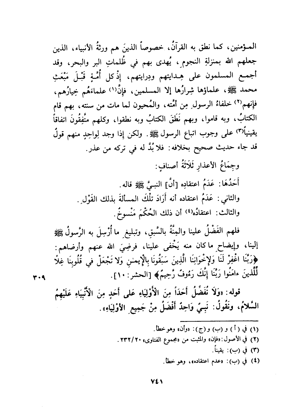 الْمُؤْمِنِينَ، كَمَا نَطَقَ بِهِ الْقُرْآنُ، خُصُوصًا الَّذِينَ هُمْ وَرَثَةُ الْأَنْبِيَاءِ، الَّذِينَ جَعَلَهُمُ اللَّهُ بِمَنْزِلَةِ النُّجُومِ، يُهْدَى بِهِمْ فِي ظُلُمَاتِ الْبَرِّ وَالْبَحْرِ. وَقَدْ أَجْمَعَ الْمُسْلِمُونَ عَلَى هِدَايَتِهِمْ وَدِرَايَتِهِمْ، إِذْ كَلُّ أُمَّةٍ قَبْلَ مَبْعَثِ مُحَمَّدٍ صَلَّى اللَّهُ عَلَيْهِ وَسَلَّمَ عُلَمَاؤُهَا شِرَارُهَا، إِلَّا الْمُسْلِمِينَ، فَإِنَّ عُلَمَاءَهُمْ خِيَارُهُمْ، فَإِنَّهُمْ خُلَفَاءُ الرَّسُولِ مِنْ أُمَّتِهِ، وَالْمُحْيُونَ لِمَا مَاتَ مِنْ سُنَّتِهِ، فَبِهِمْ قَامَ الْكِتَابُ وَبِهِ قَامُوا، وَبِهِمْ نَطَقَ الْكِتَابُ وَبِهِ نَطَقُوا، وَكُلُّهُمْ مُتَّفِقُونَ اتِّفَاقًا يَقِينًا عَلَى وُجُوبِ اتِّبَاعِ الرَّسُولِ صَلَّى اللَّهُ عَلَيْهِ وَسَلَّمَ. وَلَكِنْ إِذَا وُجِدَ لِوَاحِدٍ مِنْهُمْ قَوْلٌ قَدْ جَاءَ حَدِيثٌ صَحِيحٌ بِخِلَافِهِ -: فَلَابُدَّ لَهُ فِي تَرْكِهِ مِنْ عُذْرٍ.