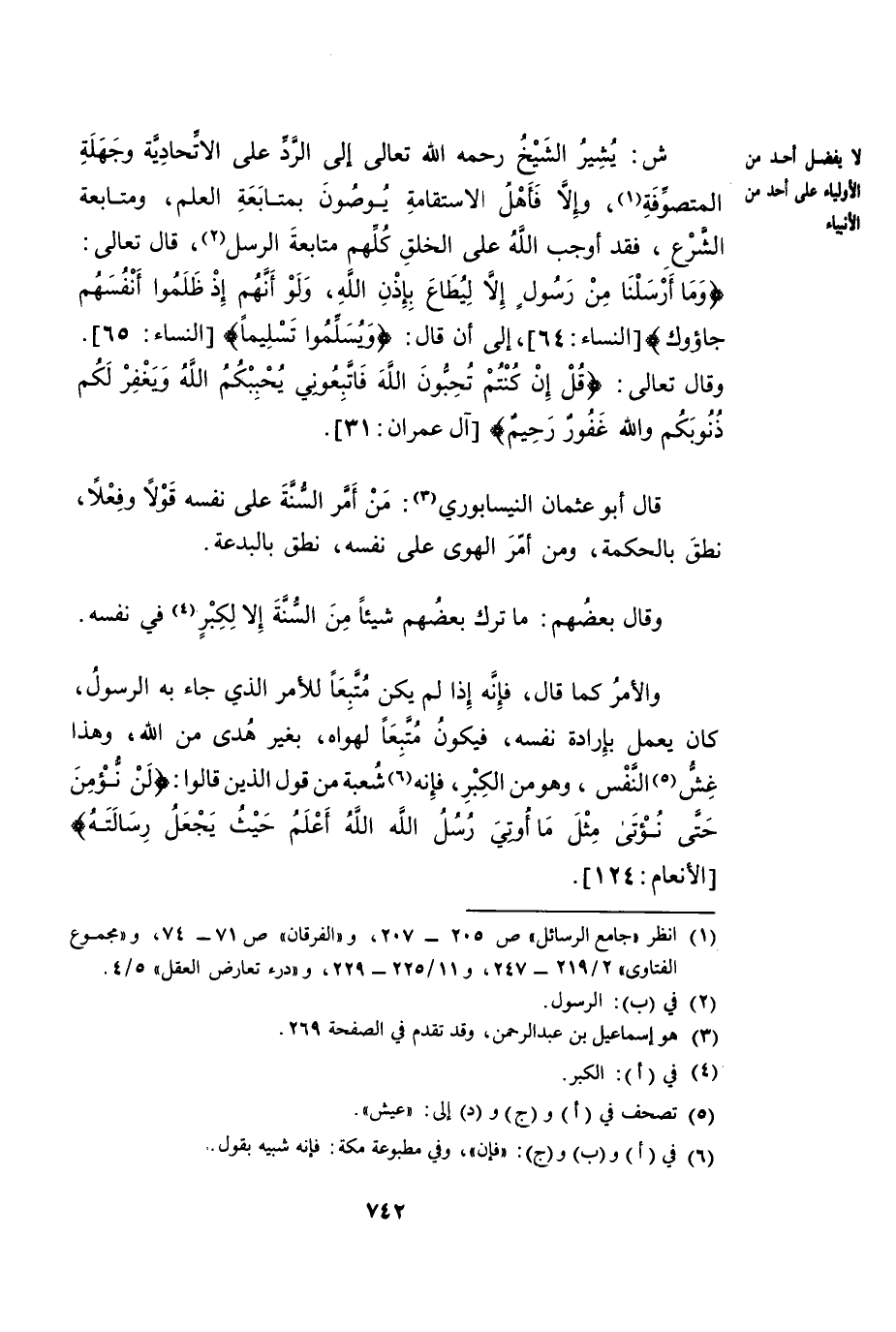 ش: يُشِيرُ الشَّيْخُ رَحِمَهُ اللَّهُ إِلَى الرَّدِّ عَلَى الِاتِّحَادِيَّةِ وَجَهَلَةِ الْمُتَصَوِّفَةِ، وَإِلَّا فَأَهْلُ الِاسْتِقَامَةِ يُوصُونَ بِمُتَابَعَةِ الْعِلْمِ وَمُتَابَعَةِ الشَّرْعِ. فَقَدْ أَوْجَبَ اللَّهُ عَلَى الْخَلْقِ كُلِّهِمْ مُتَابَعَةُ الرُّسُلِ، قَالَ تَعَالَى: {وَمَا أَرْسَلْنَا مِنْ رَسُولٍ إِلَّا لِيُطَاعَ بِإِذْنِ اللَّهِ وَلَوْ أَنَّهُمْ إِذْ ظَلَمُوا أَنْفُسَهُمْ جَاءُوكَ} [النِّسَاءِ: 64] إِلَى أَنْ قَالَ: {وَيُسَلِّمُوا تَسْلِيمًا} [النِّسَاءِ: 65] . وَقَالَ تَعَالَى: {قُلْ إِنْ كُنْتُمْ تُحِبُّونَ اللَّهَ فَاتَّبِعُونِي يُحْبِبْكُمُ اللَّهُ وَيَغْفِرْ لَكُمْ ذُنُوبَكُمْ وَاللَّهُ غَفُورٌ رَحِيمٌ} [آلِ عِمْرَانَ: 31] .
